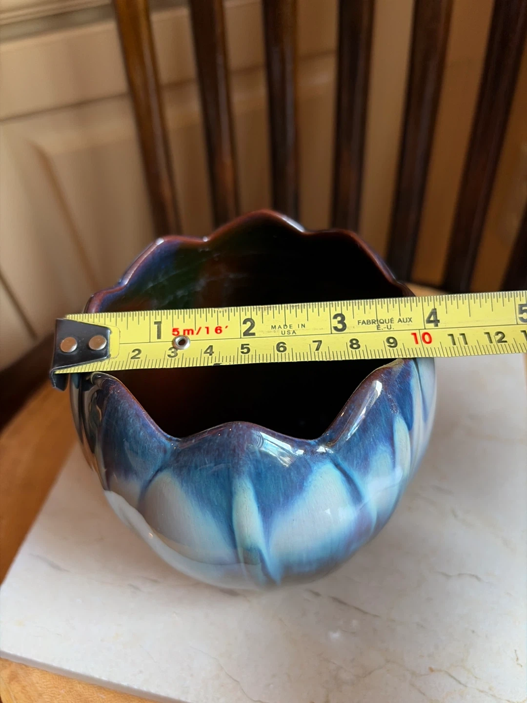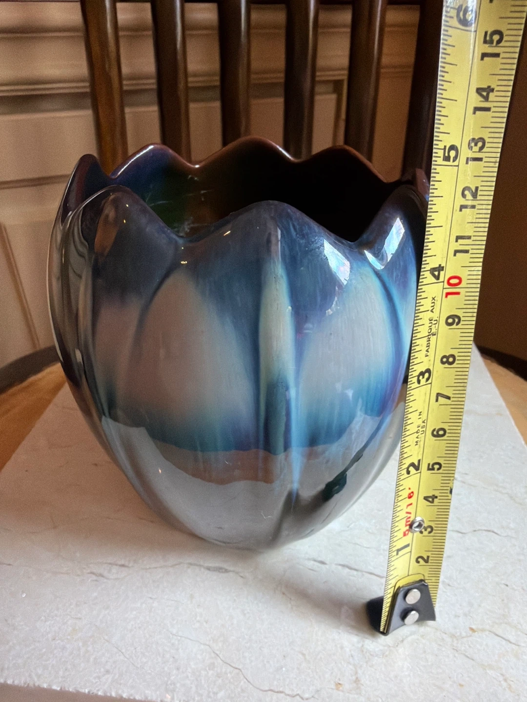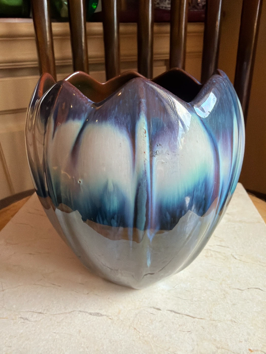 Beautiful CCC (Canadian Ceramic Craft) pottery vase/planter with a stunning blue, white and green iridescent glaze. It's a unique piece, perfect for adding a touch of artistic flair to any room. This vase is approximately 5” tall and 4” wide with a ruffled tulip opening. Maker’s mark is on the bottom. Displays lovely colours and a glossy finish! Great for a small plant or as a piece of stunning decor!