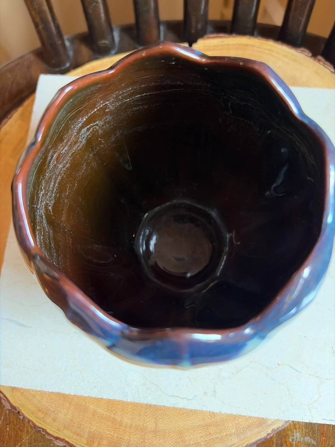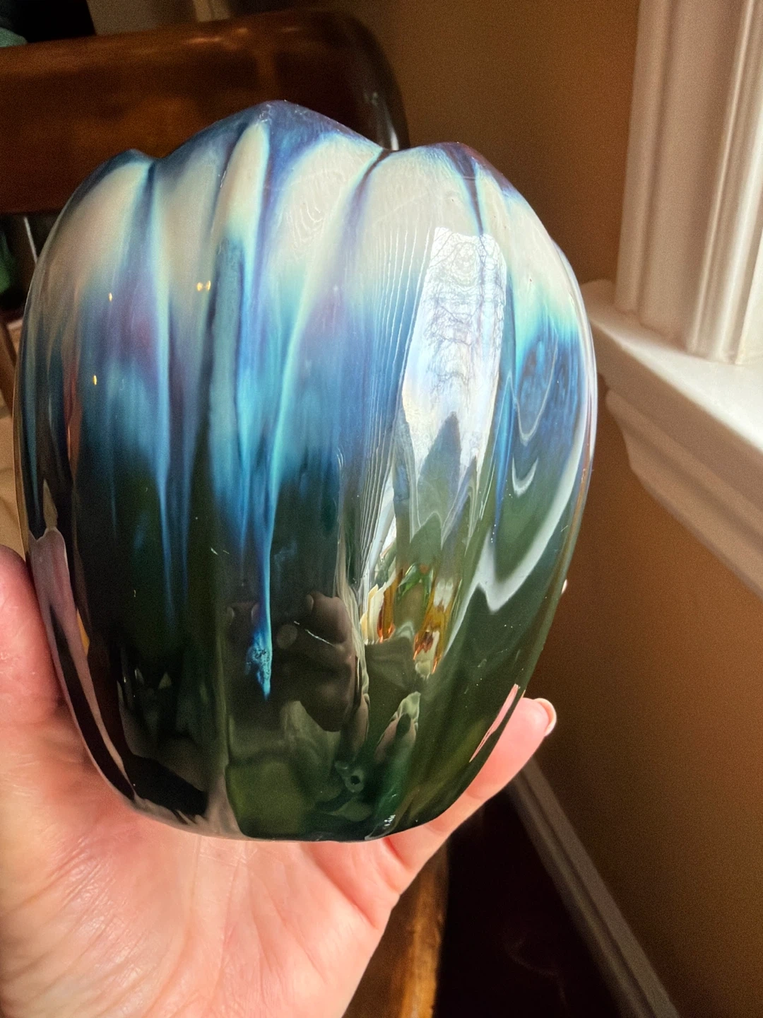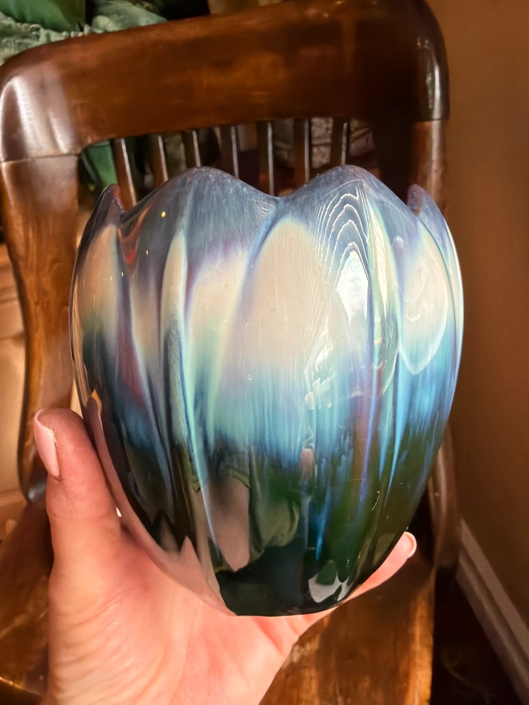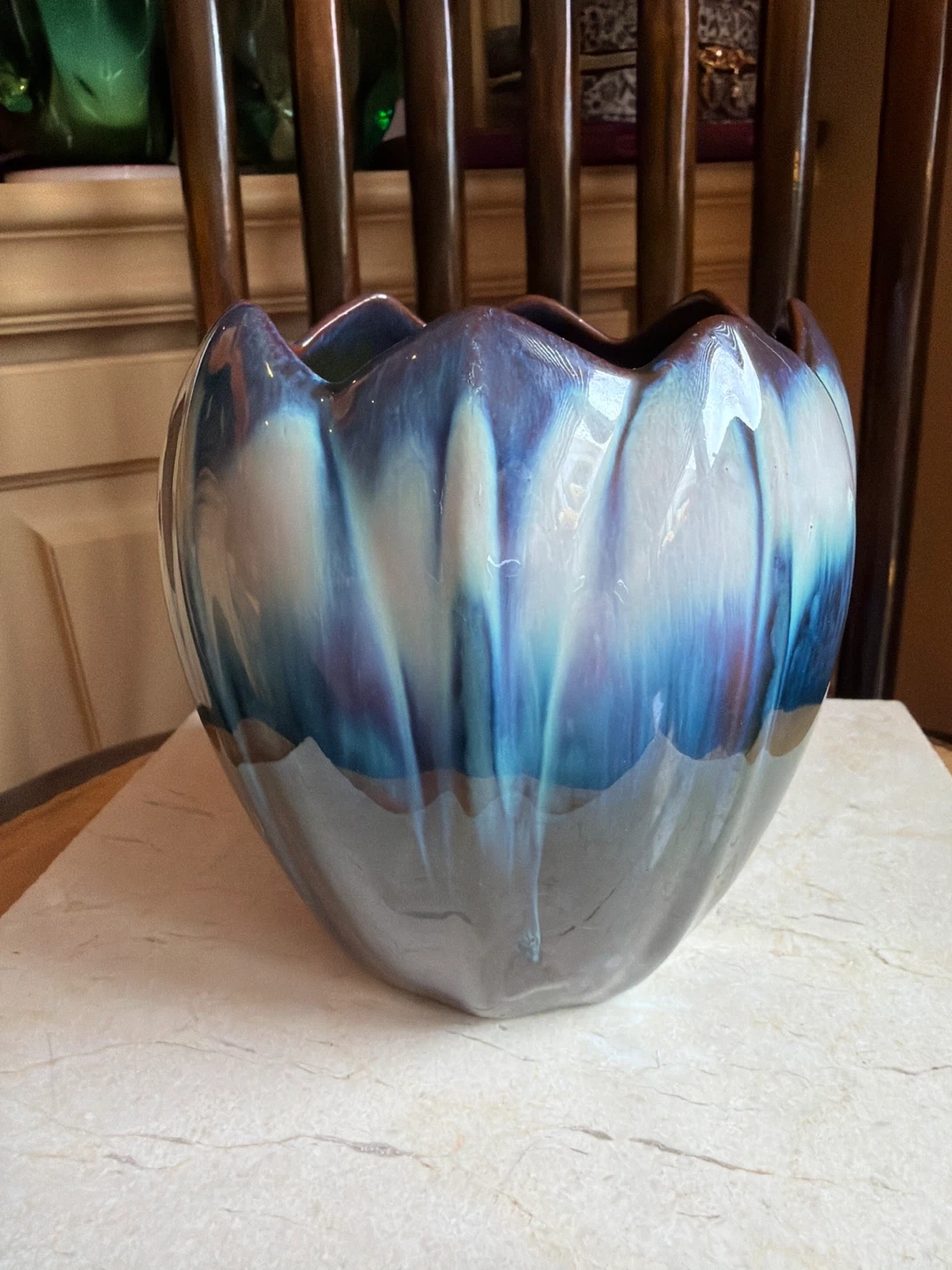 Beautiful CCC (Canadian Ceramic Craft) pottery vase/planter with a stunning blue, white and green iridescent glaze. It's a unique piece, perfect for adding a touch of artistic flair to any room. This vase is approximately 5” tall and 4” wide with a ruffled tulip opening. Maker’s mark is on the bottom. Displays lovely colours and a glossy finish! Great for a small plant or as a piece of stunning decor!