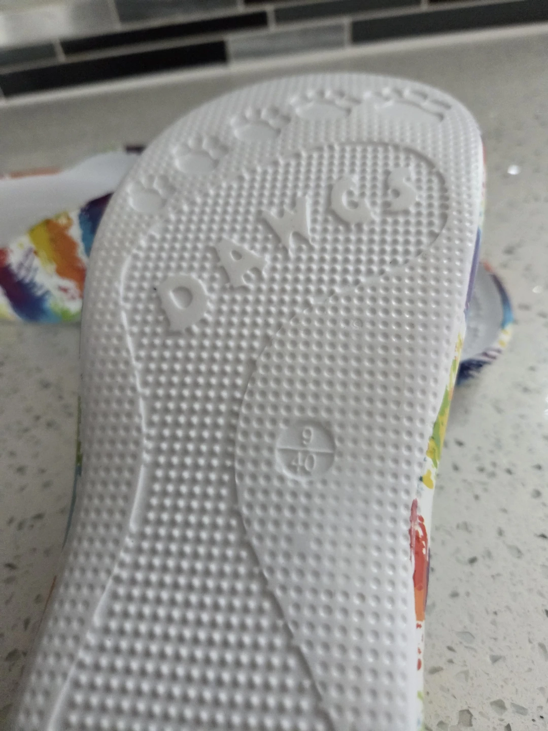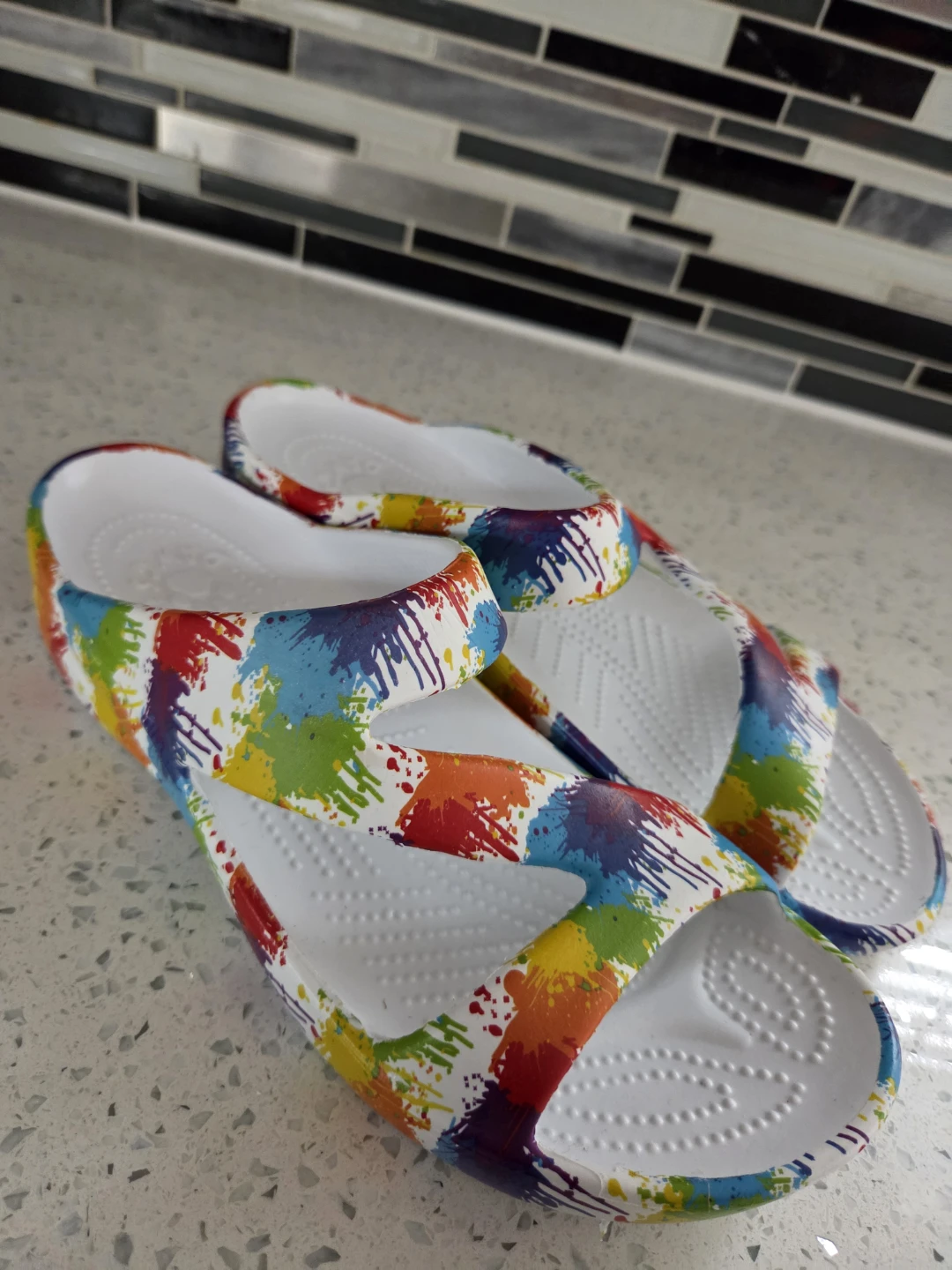 These DAWGS sandals feature a fun artist palette splatter print. They're a size 9 (40 EU). Rubber material for durability and comfort.
