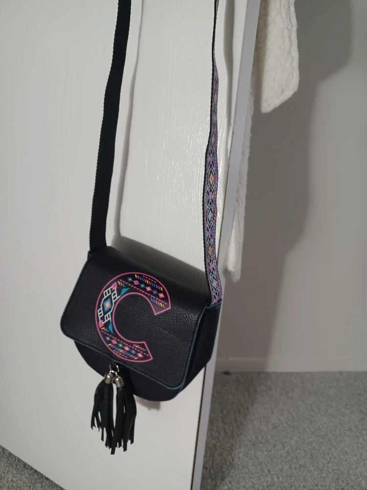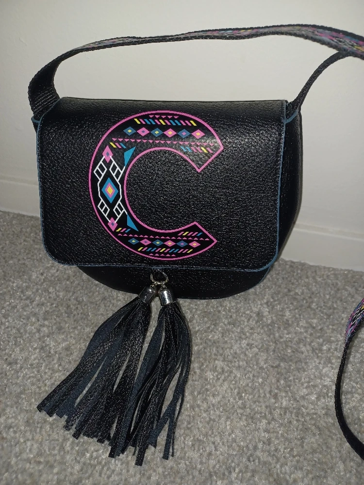 Cute black crossbody bag from Justice! It features a fun, colourful 'C' design on the front and stylish tassels.