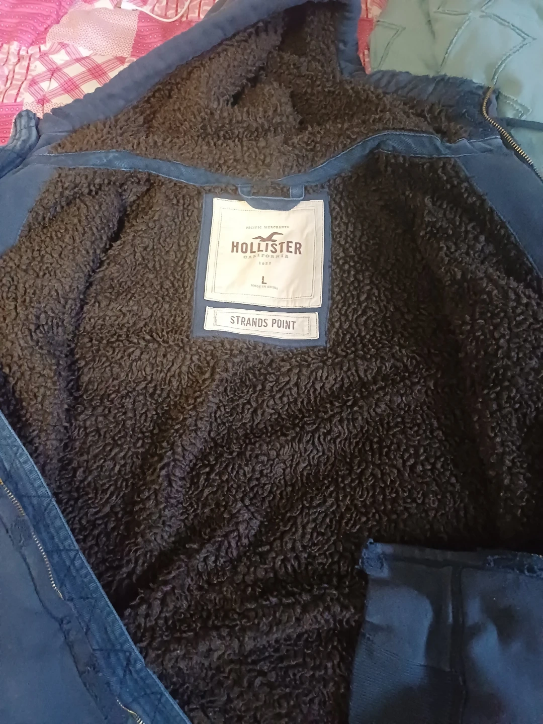 This is a Hollister zip-up hoodie, size large, with a cozy sherpa lining. It's a dark navy blue colour with the 'Hollister' logo across the chest. Perfect for cooler Canadian weather!