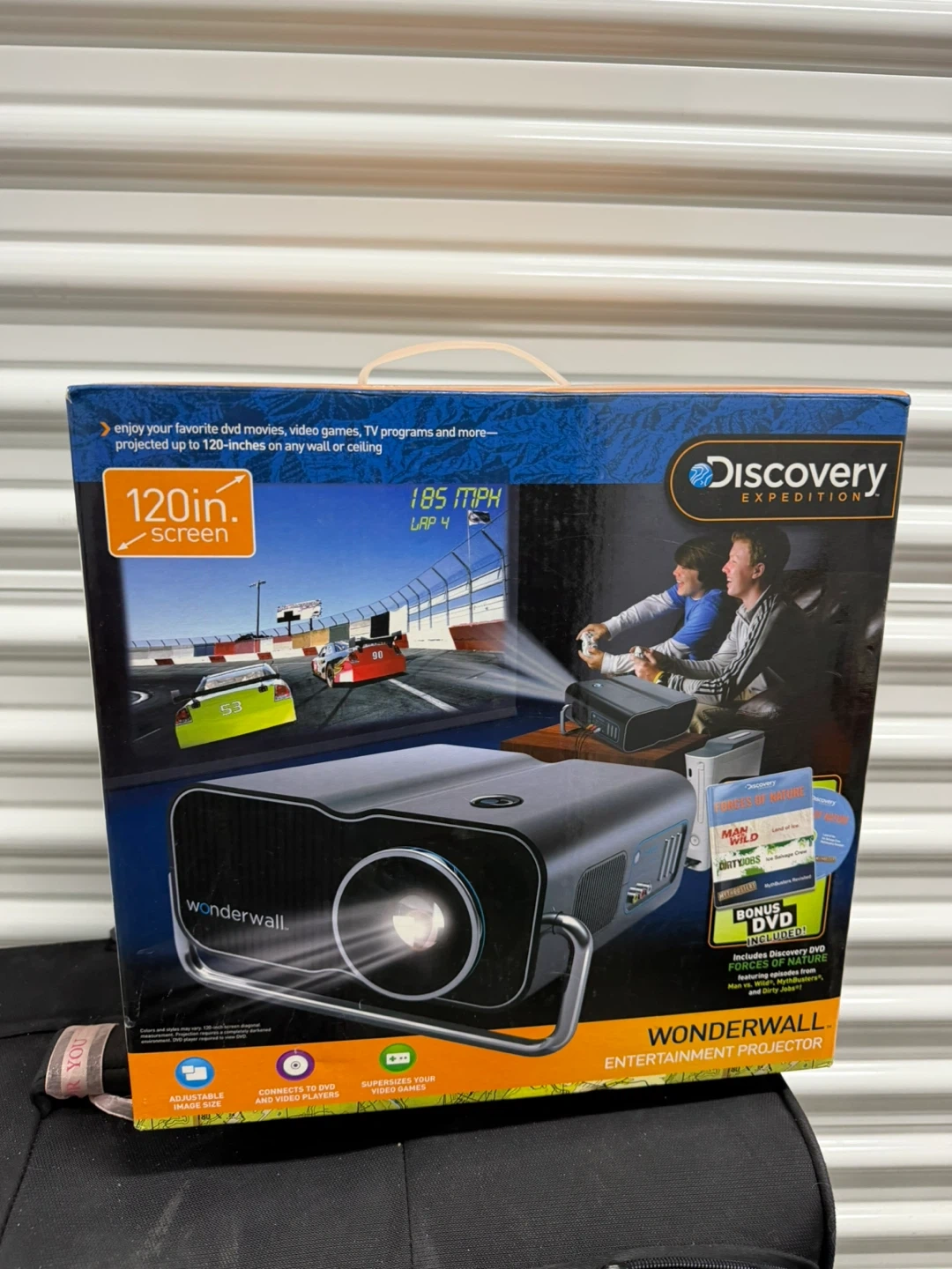Enjoy movies, video games, and TV programs projected up to 120 inches. This Wonderwall Entertainment Projector connects to DVD and video players, supersizing your gaming experience. Includes a bonus Discovery DVD with episodes from "Man vs. Wild," "MythBusters," and "Dirty Jobs."