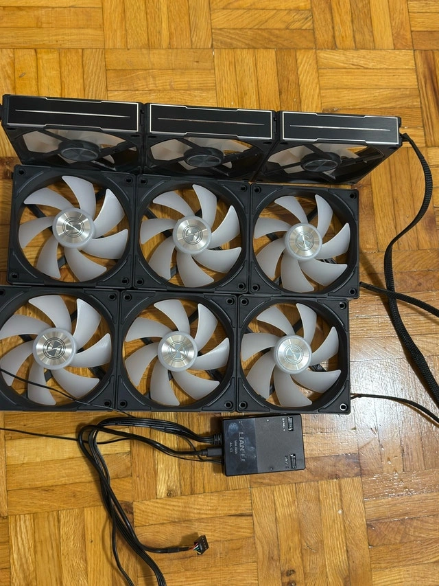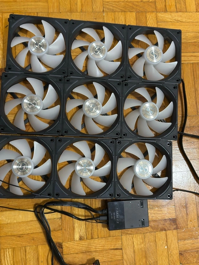 Nine Lian Li UNI FAN SL120 V2 RGB computer fans included. These are great for PC builds needing extra cooling and customizable lighting. Connects via the included controller for easy management. Designed for efficient airflow and quiet operation. Asking $360 for the 9-pack.