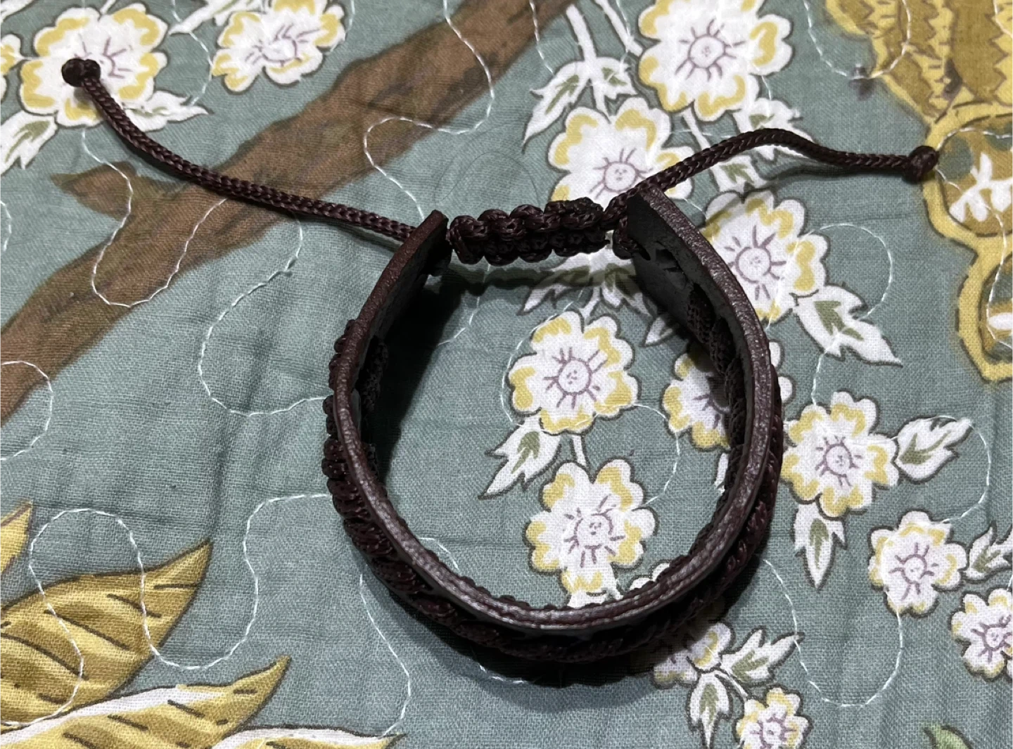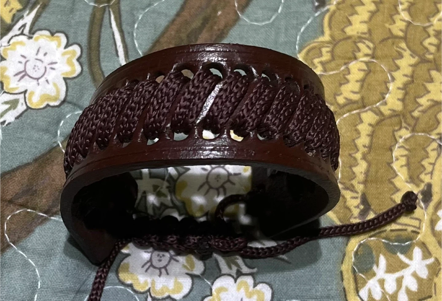 This bracelet features a brown leather band with intricate braided cord detailing. It has an adjustable tie closure. It's a stylish accessory for everyday wear.