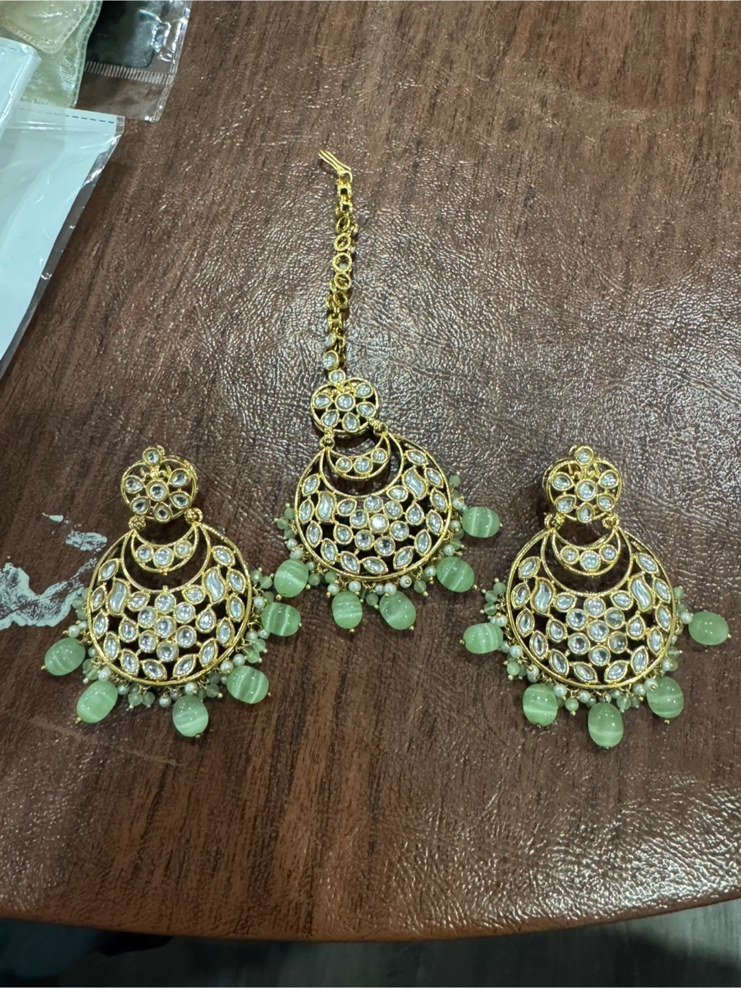 Gold Tone Kundan Earrings and Tikka Set with Green Beads