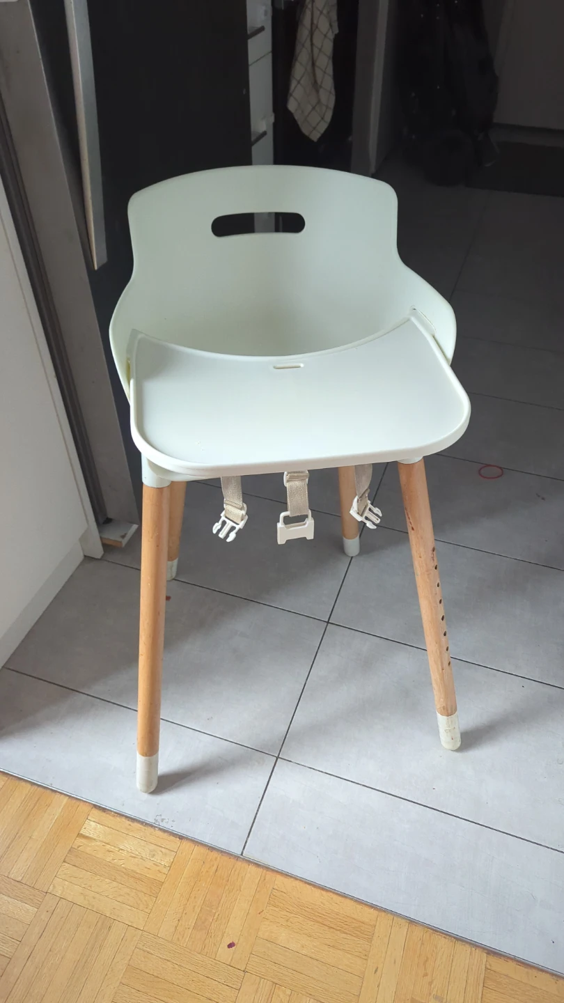 This baby high chair features a white plastic seat and a removable tray. It has wooden legs with adjustable height settings. The chair includes a 3-point harness for safety. It's great for feeding little ones.