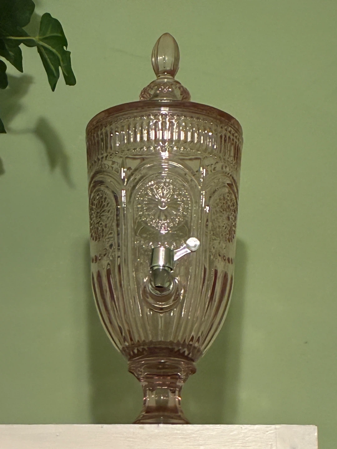 This decorative glass beverage dispenser comes in a lovely pink hue. It features an ornate embossed design and a convenient metal spigot for easy pouring. It's perfect for serving drinks at parties or gatherings!