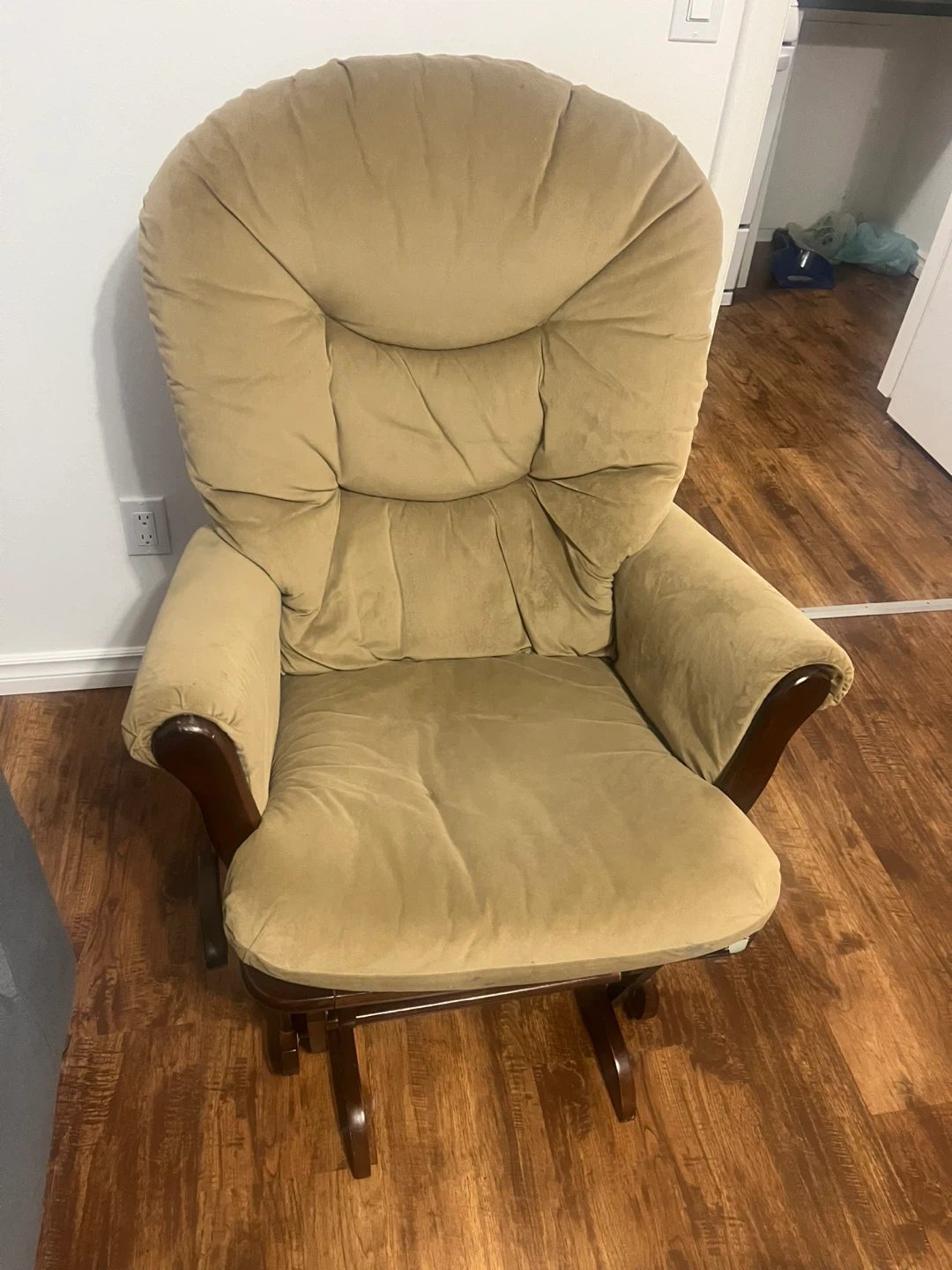 Comfortable plush glider rocking chair in a tan colour. It has upholstered arms and a high padded back. The wooden base allows for smooth gliding motion. Perfect for a nursery or living space! Price 40$