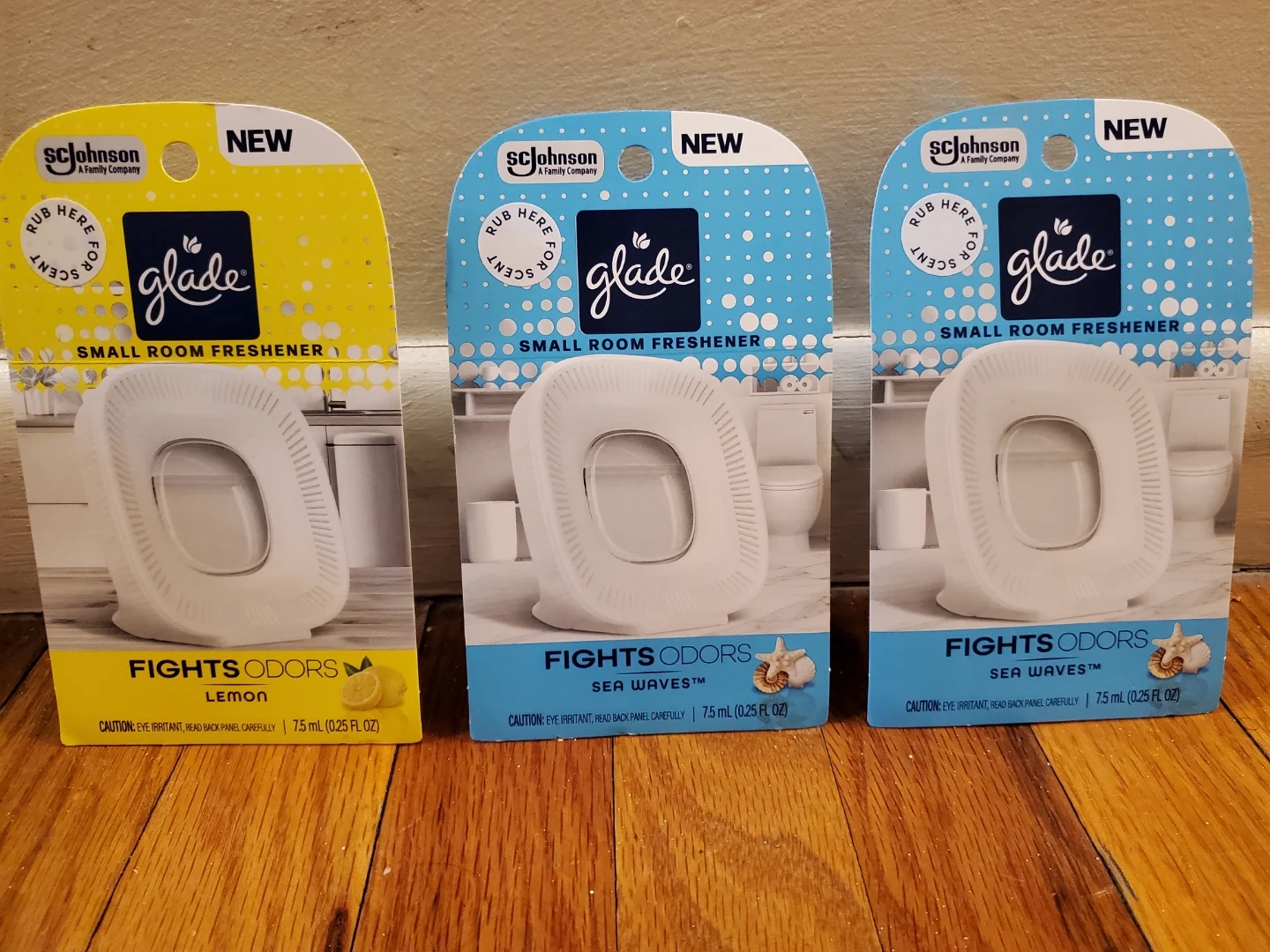 Glade small room fresheners. Includes one Lemon scent and two Sea Waves scents. Each unit contains 7.5 mL (0.25 FL OZ). These are designed to fight odors in small spaces. Eye irritant, read back panel carefully.