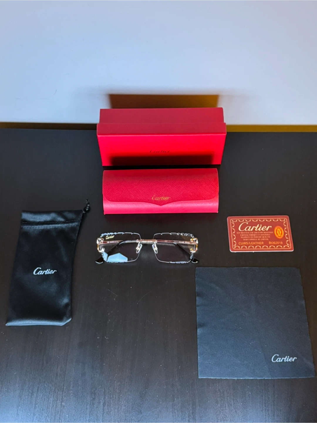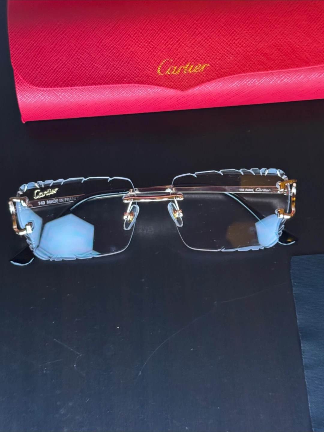 These Cartier rimless sunglasses come with their original case, pouch, and authenticity card. They're made in France with a 140 size measurement. A sophisticated accessory for sunny days!