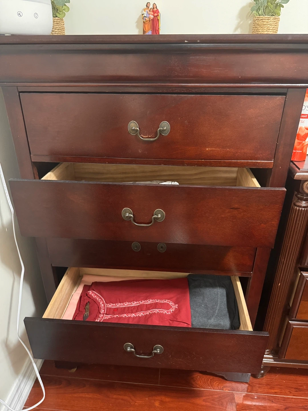 A classic wooden dresser with five drawers. It's made of a rich, dark wood and features antique-style brass hardware. This dresser offers plenty of storage for clothes or linens.
