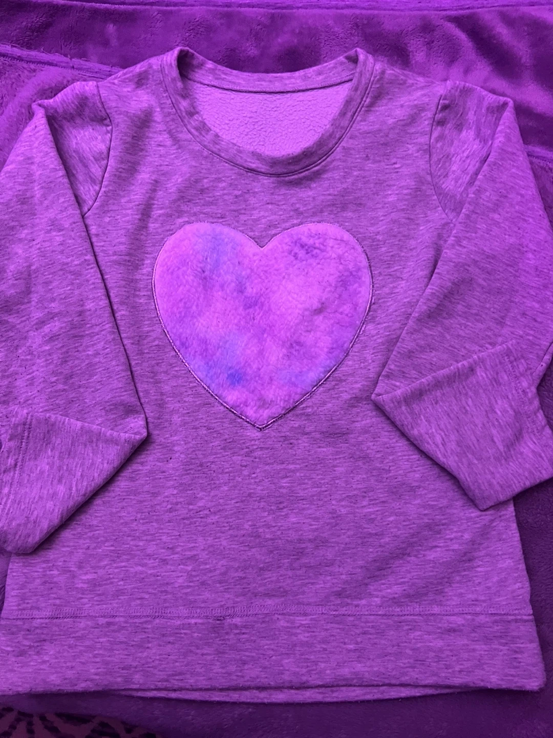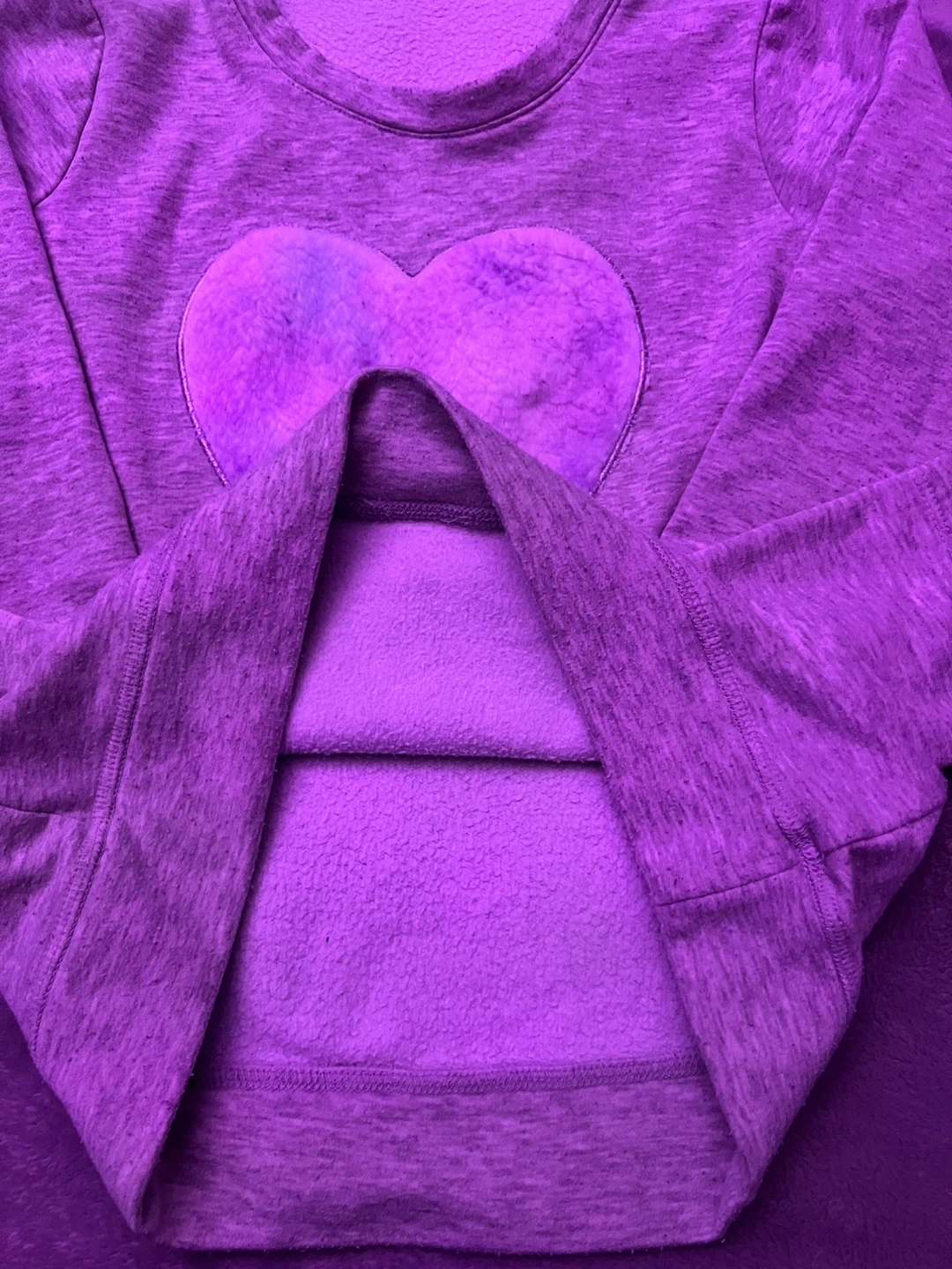 Grey crewneck sweatshirt for kids featuring a fluffy, iridescent heart graphic on the front. It's made from a soft fleece-lined material for warmth. Crewneck design with long sleeves.