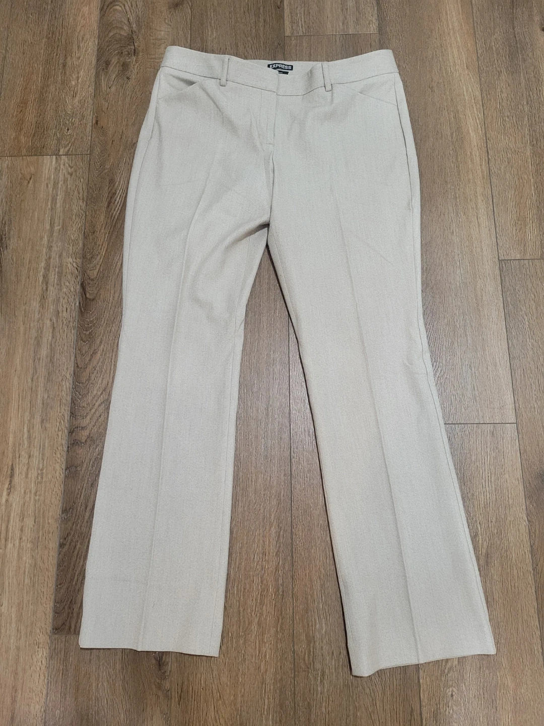 These are Express Editor pants in a size 12 Regular. They are a light beige color and made from a linen blend fabric. The pants have a classic fit with a button and zipper closure.