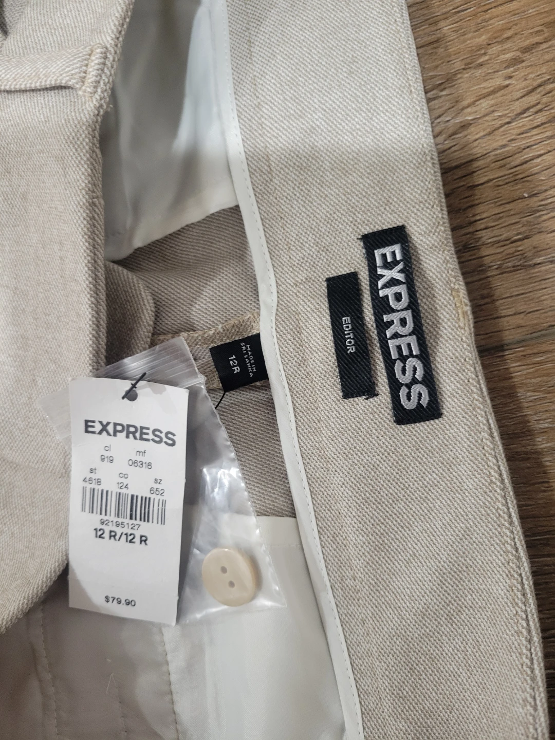 These are Express Editor pants in a size 12 Regular. They are a light beige color and made from a linen blend fabric. The pants have a classic fit with a button and zipper closure.