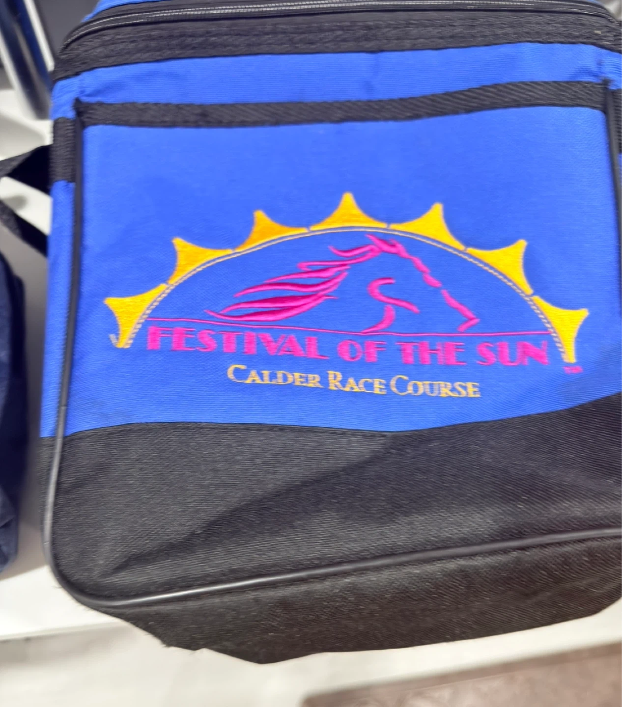 Three bags are included: a tan canvas duffle bag, a black tote bag with a large 'P' logo, and a blue lunch bag with 'Festival of the Sun Calder Race Course' branding. There's also a denim-style lunch bag with purple handles. Suitable for travel or everyday use. PICK UP HAS TO BE BY SUNDAY ONE BAG PER PERSON-CLEAN USED BAGS
