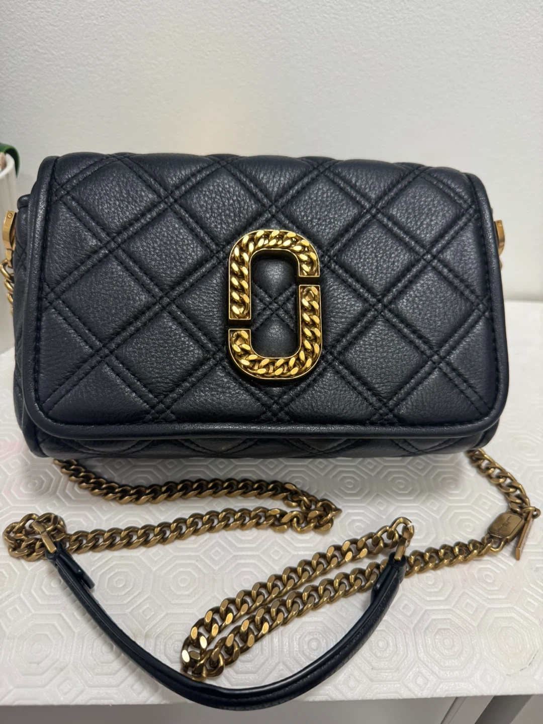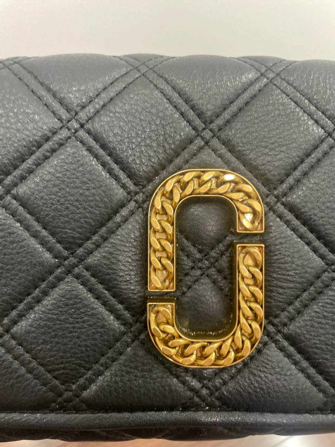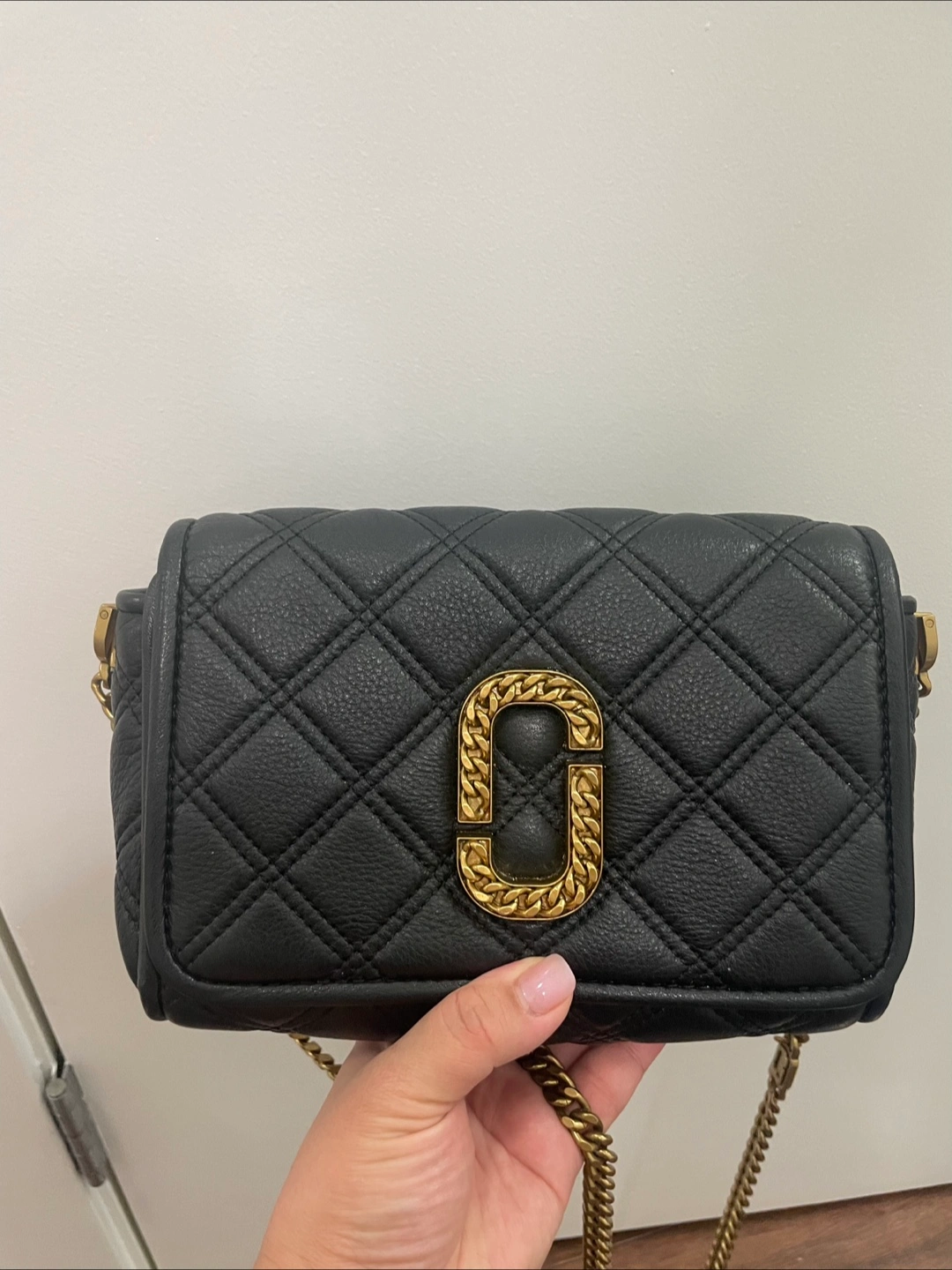Selling a gently used Marc Jacobs crossbody bag in black leather. It features a quilted design and a gold chain strap. Perfect for everyday use!