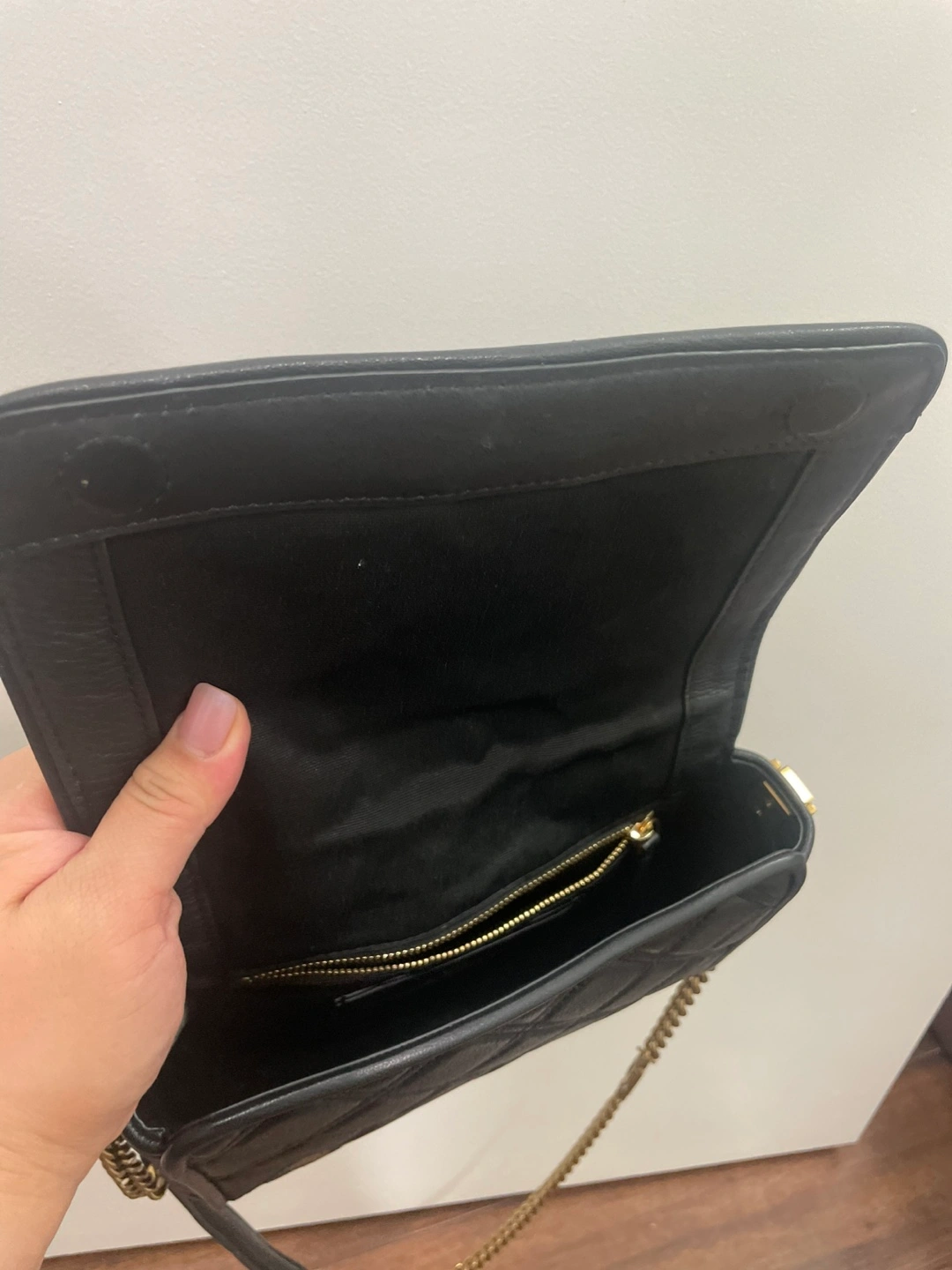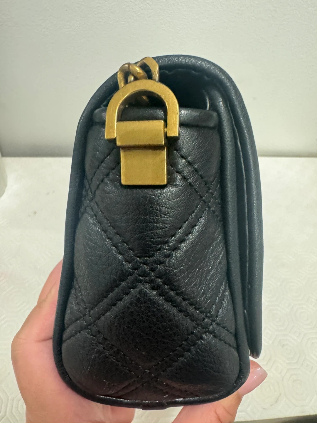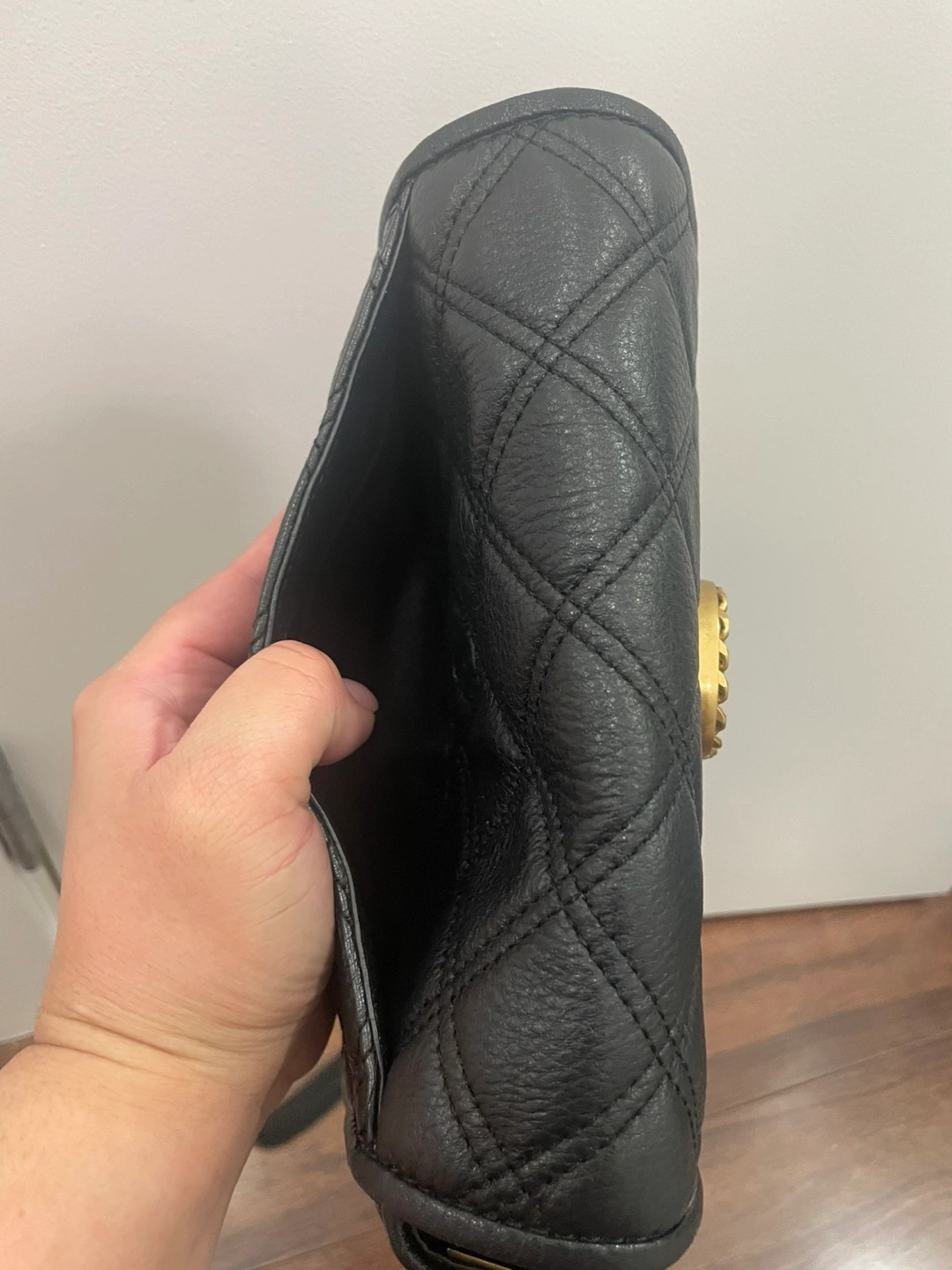 Selling a gently used Marc Jacobs crossbody bag in black leather. It features a quilted design and a gold chain strap. Perfect for everyday use!