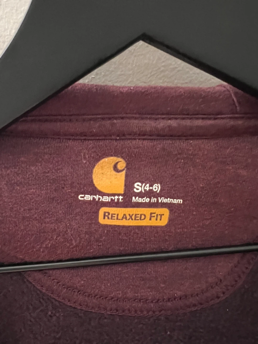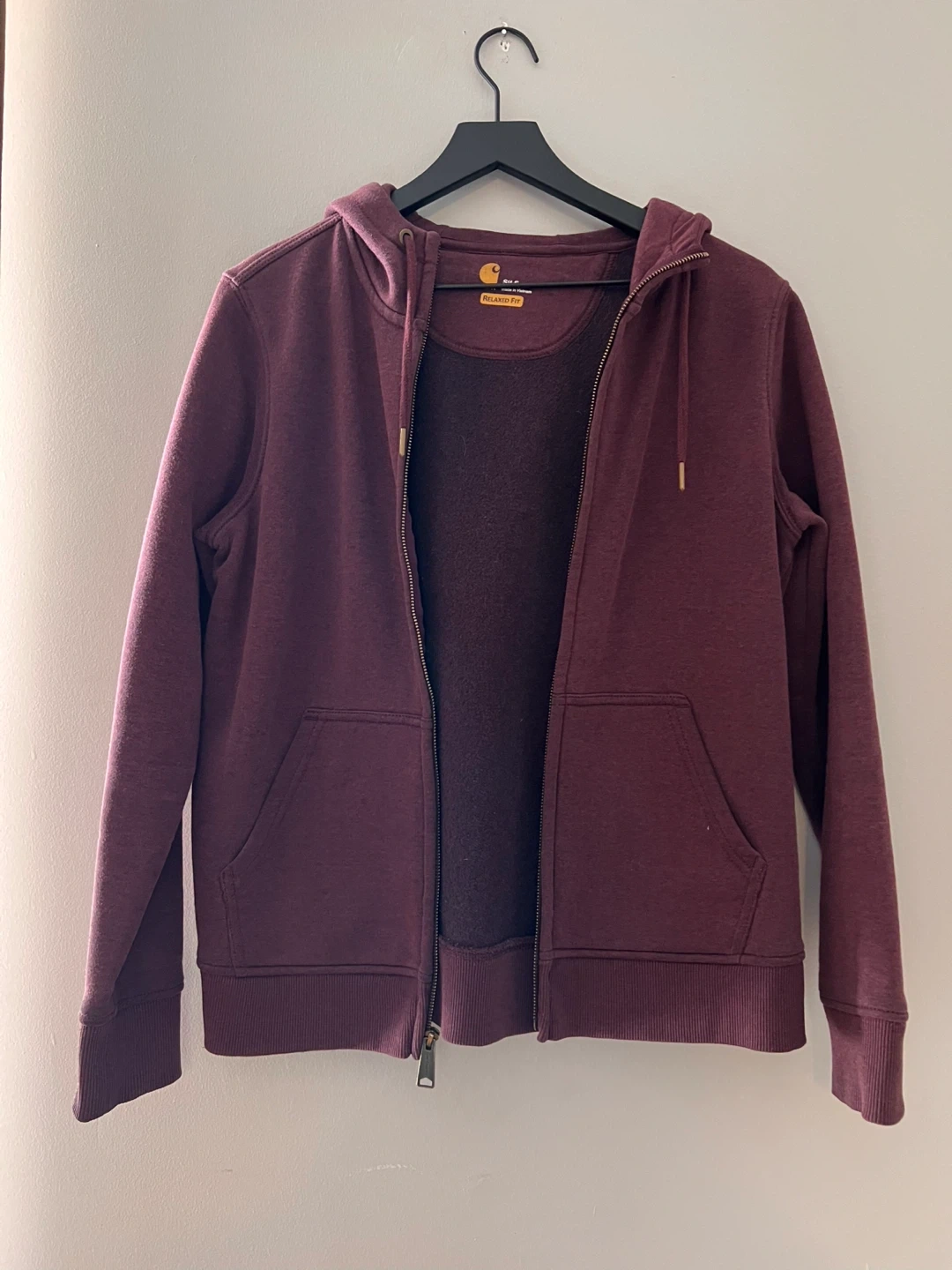 Selling a Carhartt relaxed fit full zip hoodie in size S (4-6). It's a nice burgundy color and in great condition!