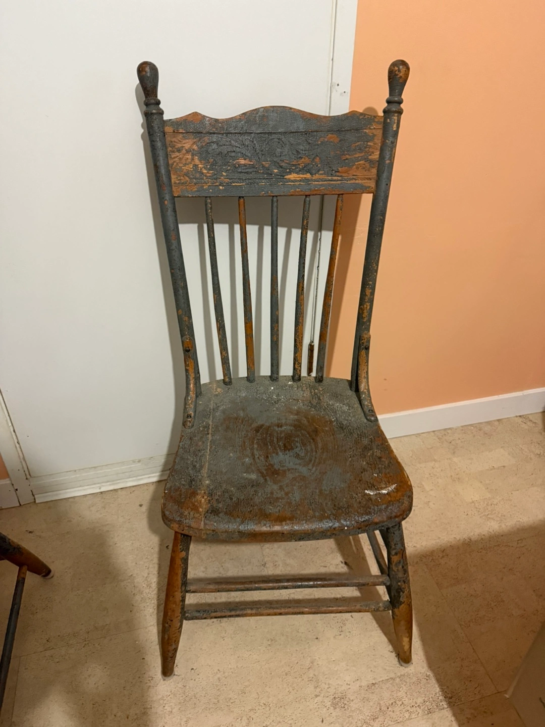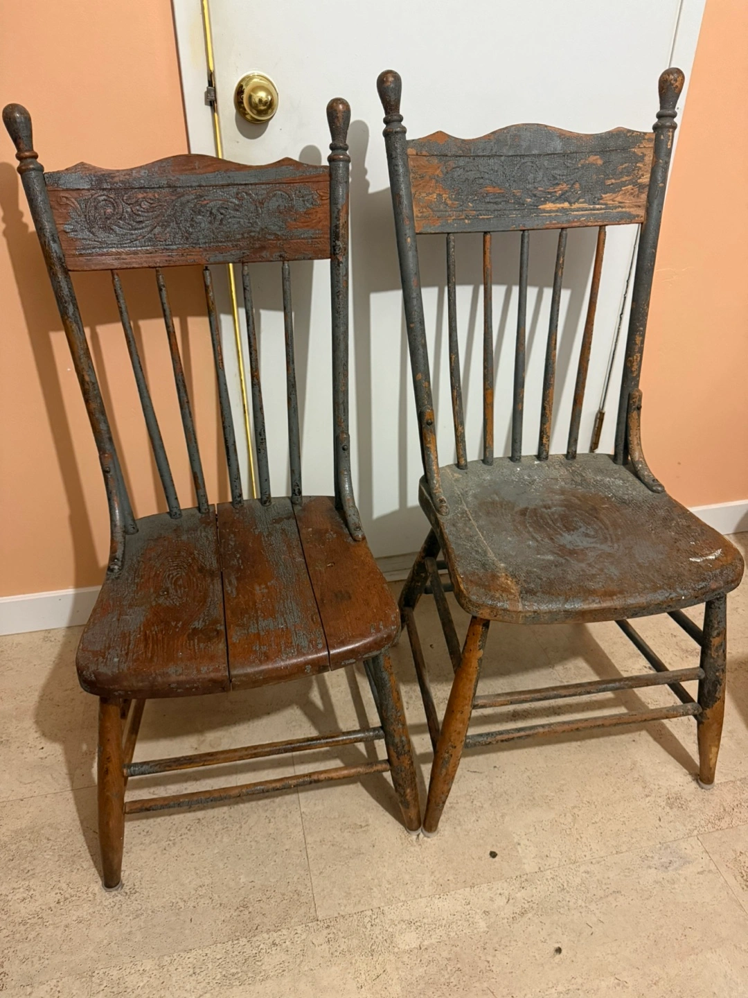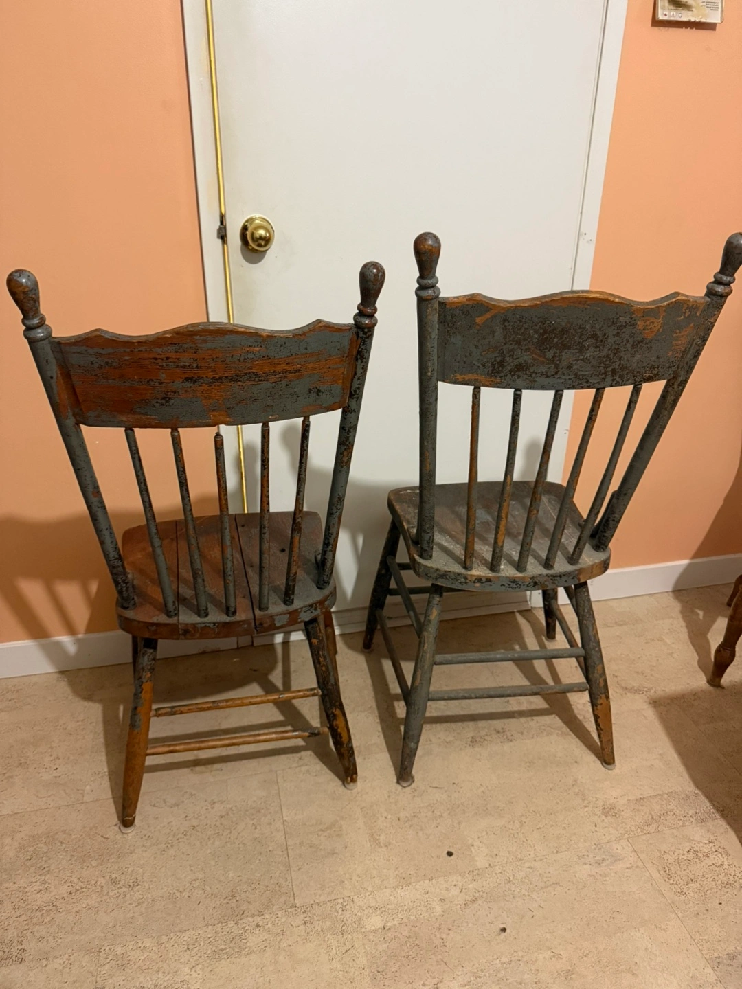 Selling a set of two vintage wooden chairs. They show signs of wear and tear, adding to their unique character. Perfect for adding a rustic touch to your home!