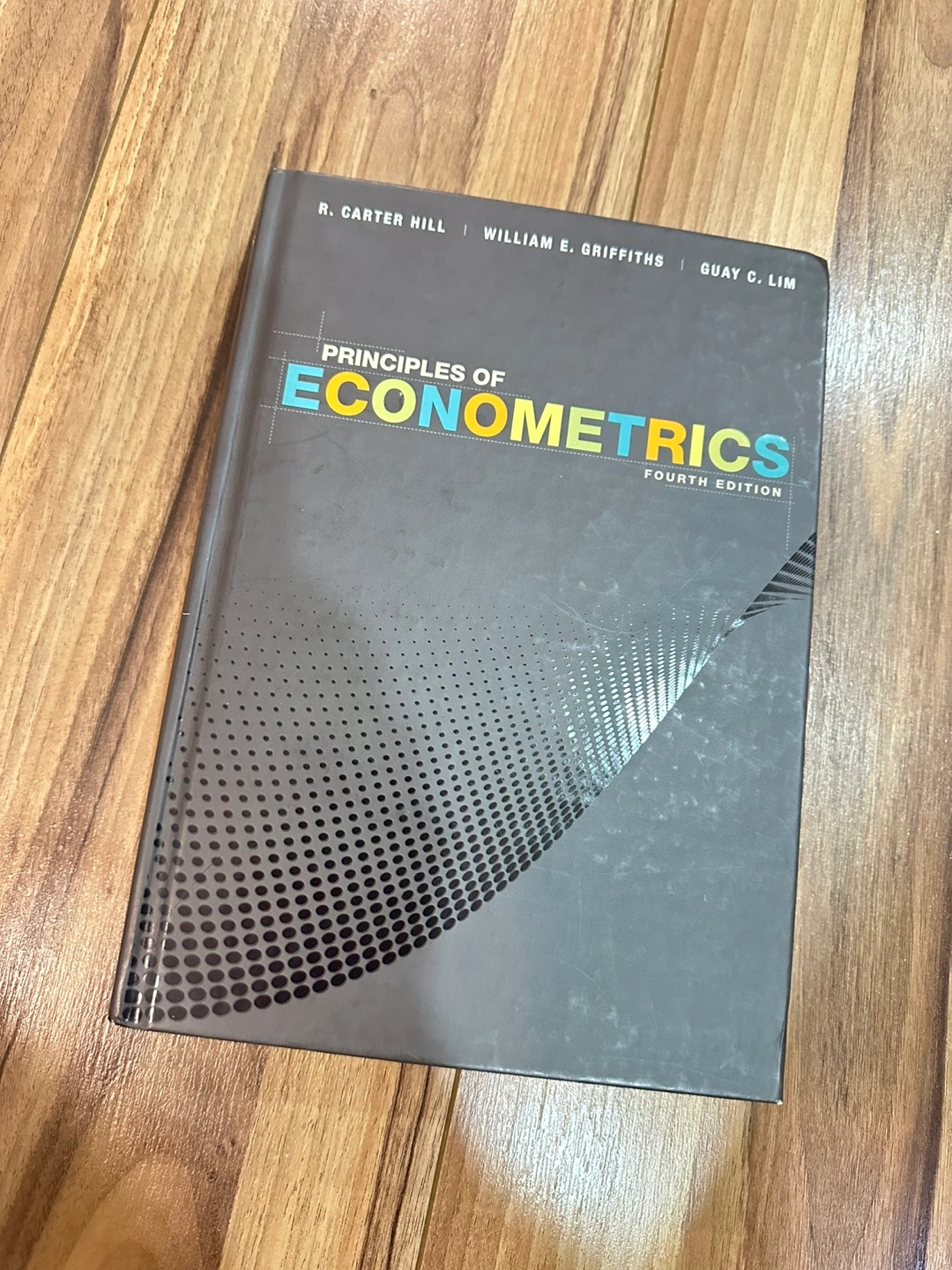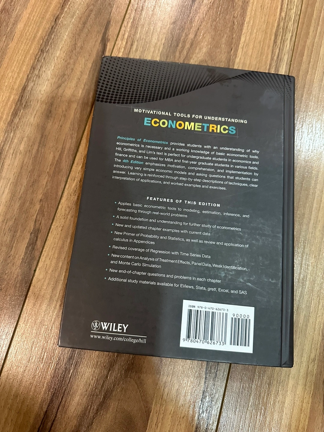 Selling a copy of Principles of Econometrics, Fourth Edition, by R. Carter Hill, William E. Griffiths, and Guay C. Lim. This book provides a solid foundation for understanding econometrics and is great for students in economics, finance, and related fields. It includes new and updated chapter examples with current data