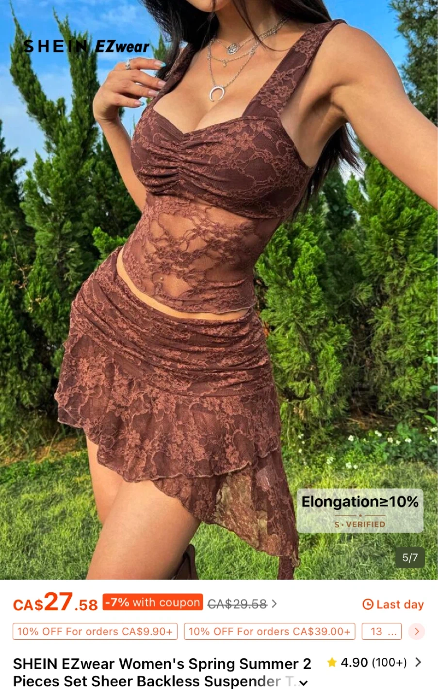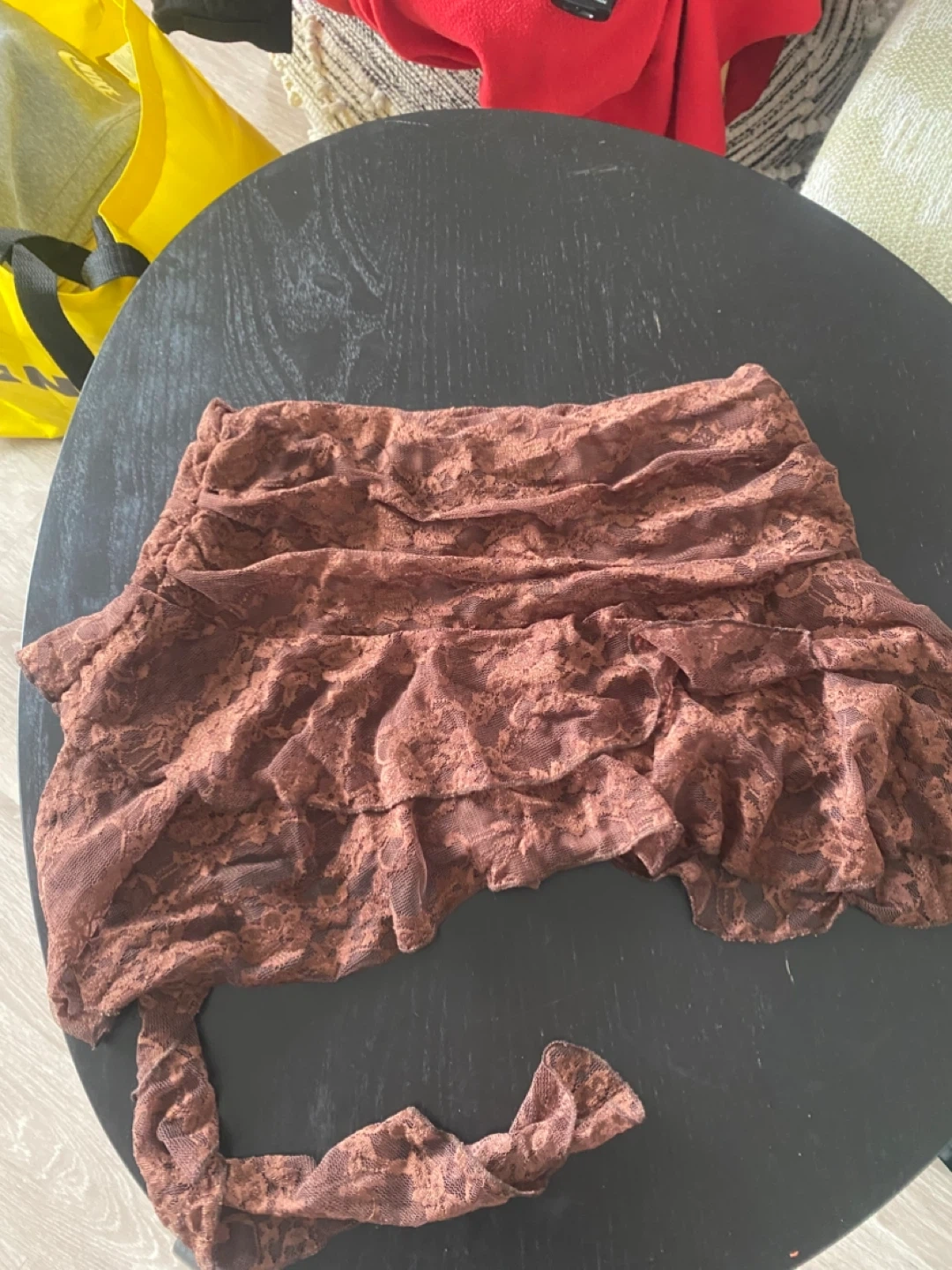 This is a SHEIN EZwear women's 2-piece set featuring a brown sheer lace top and a ruffled skirt that has built in shorts.