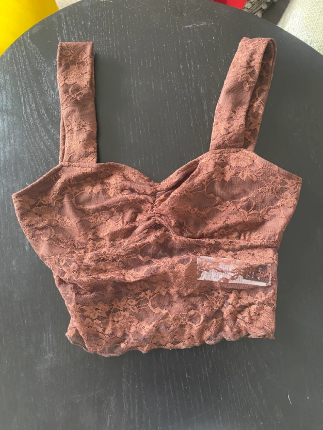 This is a SHEIN EZwear women's 2-piece set featuring a brown sheer lace top and a ruffled skirt that has built in shorts.