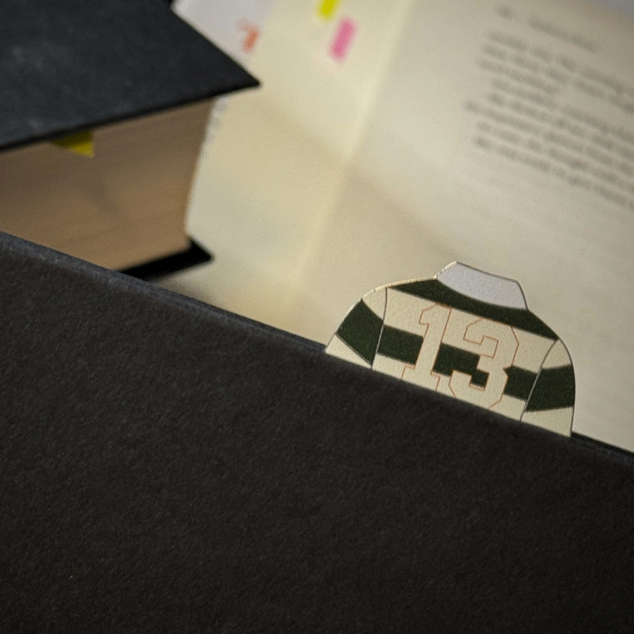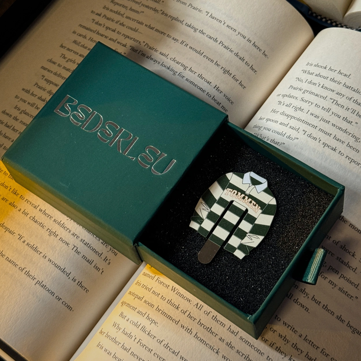 This is an original metal bookmark based on the Tommen rugby jersey. It is designed to stay flat against your page without being bulky.