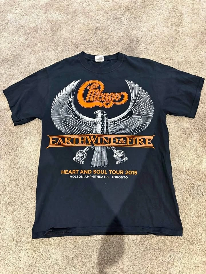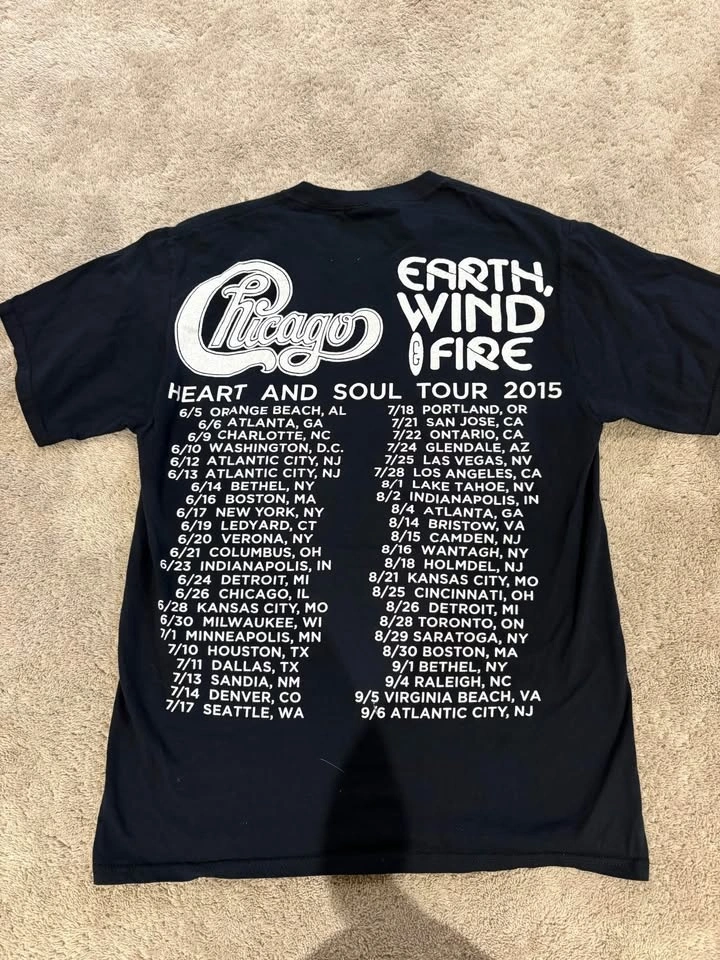 Cool Chicago and Earth Wind & Fire Heart and Soul Tour 2015 T-shirt. Medium size. Has 100% cotton material. Tour dates listed on back. No rips or stains.