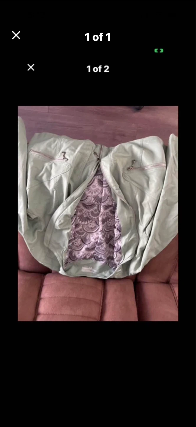 This is a light green jacket featuring a stylish patterned lining. It has a zipper closure and two front pockets. Great for a casual look! practically brand new
