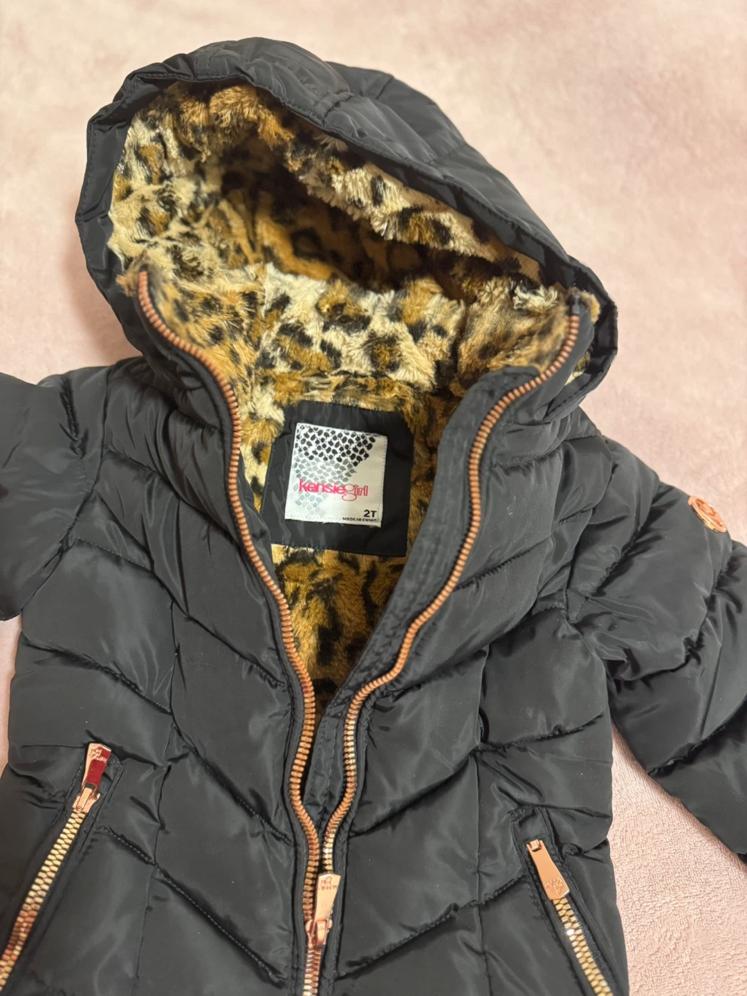 Cute black puffer jacket from Karise Girl in size 2T! It has a fun leopard print lining in the hood and body. The zippers are a stylish rose gold colour, too