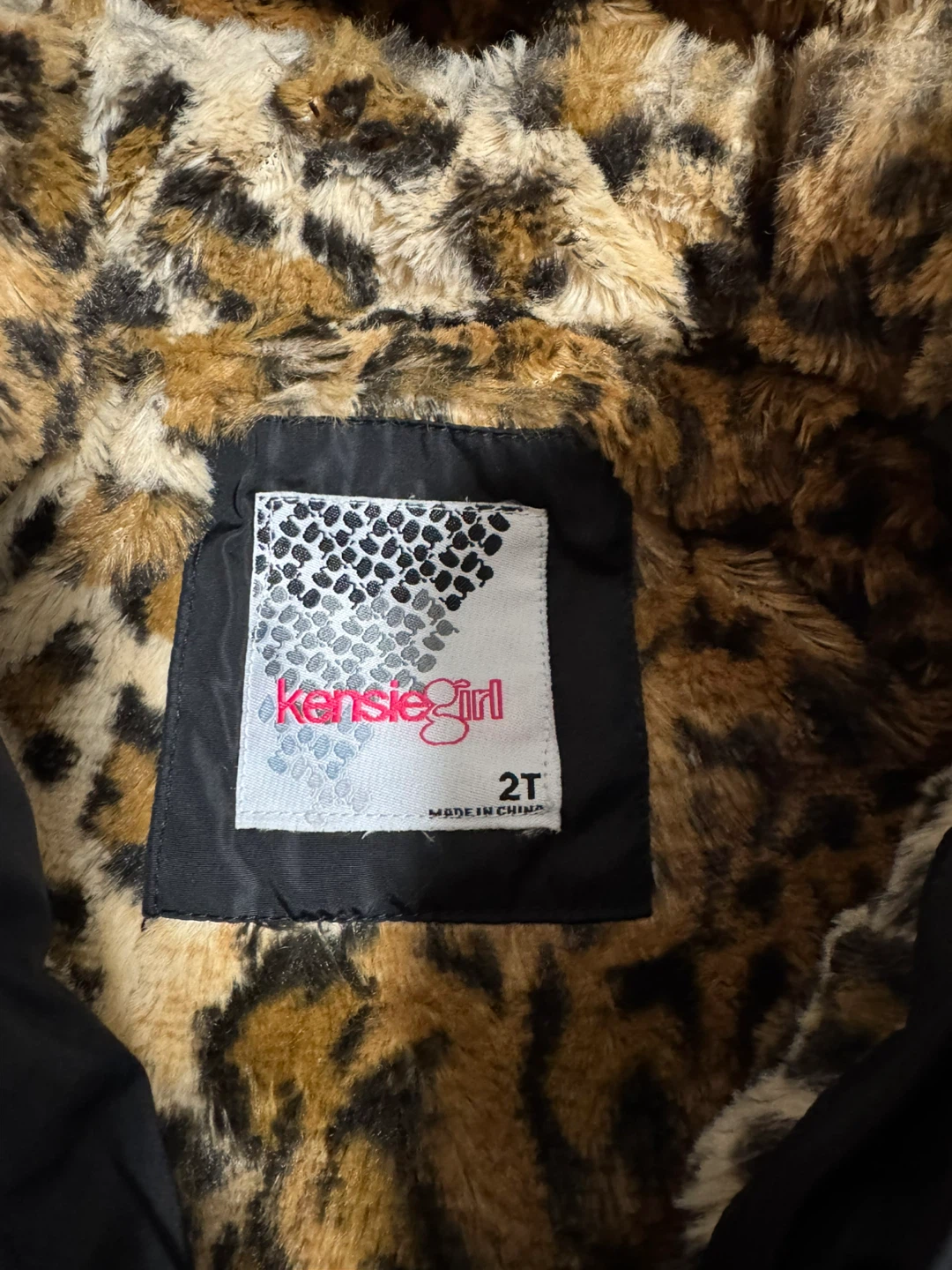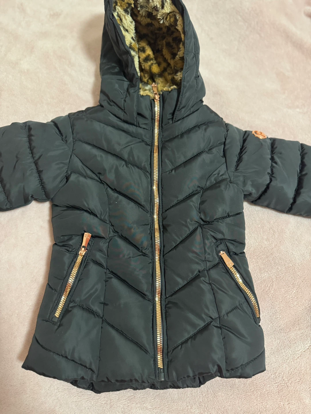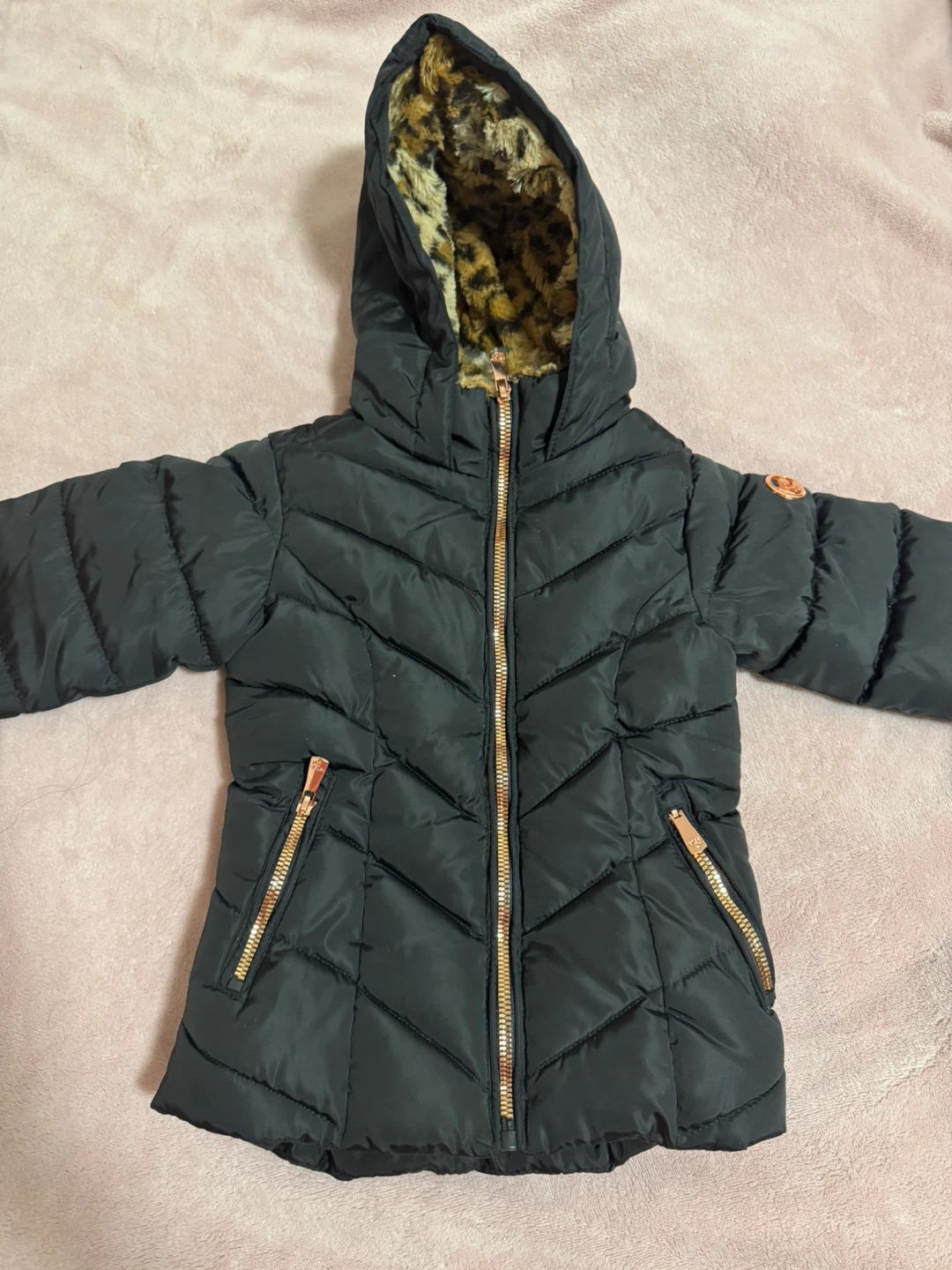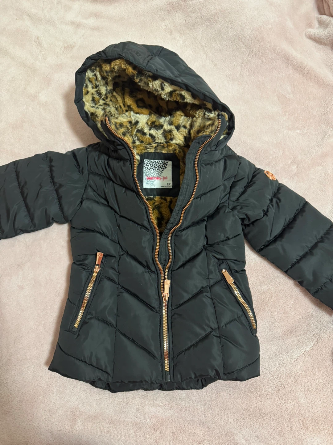 Cute black puffer jacket from Karise Girl in size 2T! It has a fun leopard print lining in the hood and body. The zippers are a stylish rose gold colour, too