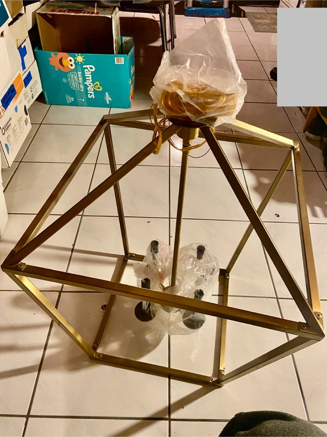 This gold chandelier has a striking geometric design. It's a beautiful statement piece for any room. The fixture is made of metal and comes with packaging for the components.