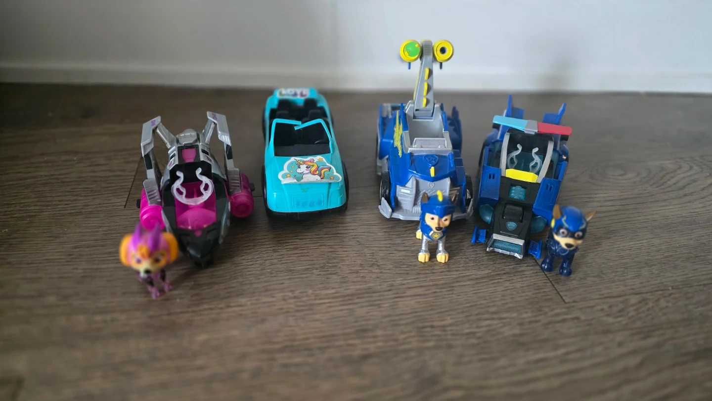 Selling a bundle of Paw Patrol toy cars and figures! Includes Skye's vehicle, a blue car with a unicorn sticker, and other Paw Patrol vehicles and characters. Great for any Paw Patrol fan. The toys are interactive with light and sound effects