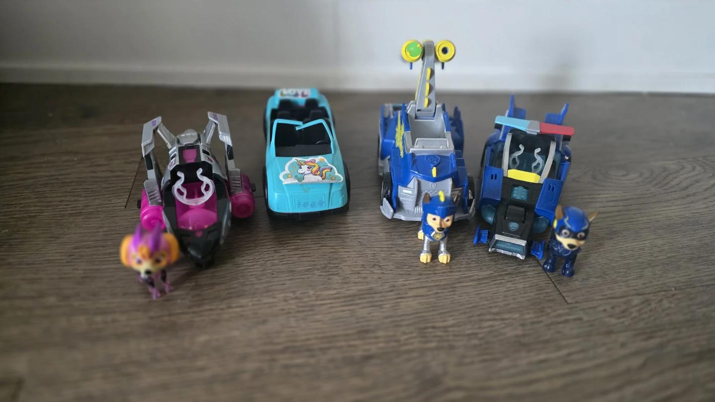 Selling a bundle of Paw Patrol toy cars and figures! Includes Skye's vehicle, a blue car with a unicorn sticker, and other Paw Patrol vehicles and characters. Great for any Paw Patrol fan. The toys are interactive with light and sound effects