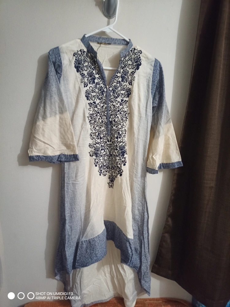A lovely tunic top featuring a unique blue floral embroidery design on a white background, with blue accents on the sleeves and hem. Perfect for adding a touch of elegance to your wardrobe!