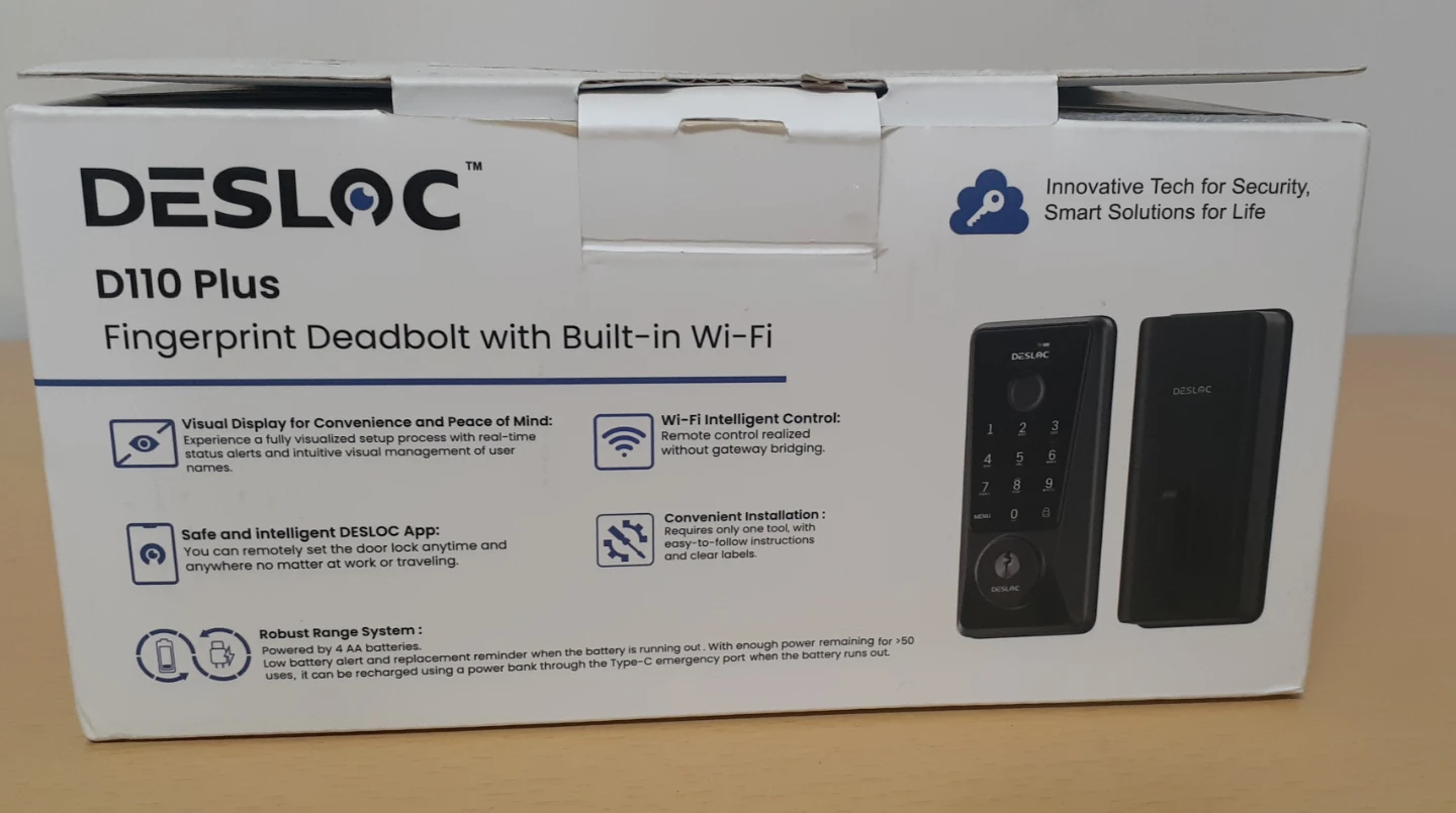This is a DESLOC D110 Plus series fingerprint deadbolt with built-in Wi-Fi. It offers visual display for convenience and peace of mind, along with Wi-Fi intelligent control. It's powered by 4 AA batteries and comes with a user manual and keys.
