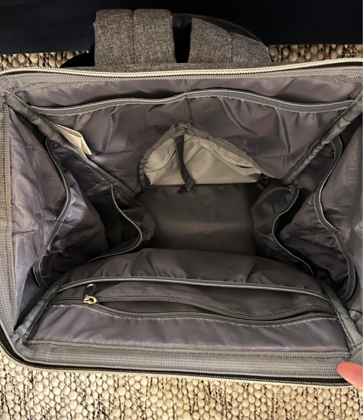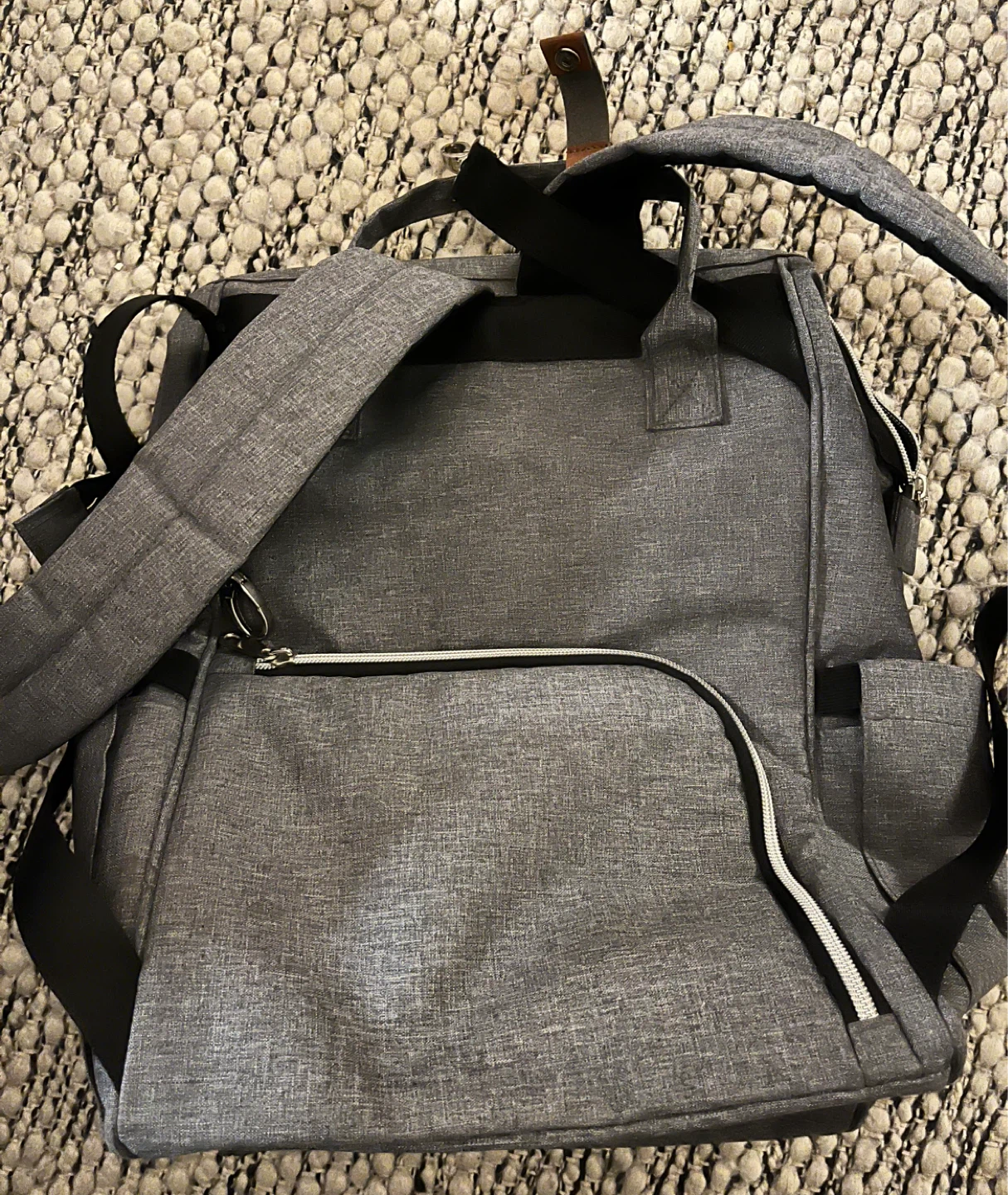 Selling a LekeBaby diaper bag backpack in grey. It's almost brand new and has tons of compartments inside to keep everything organized, plus an insulated pocket for baby bottles.