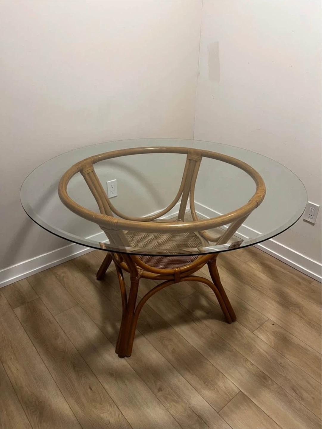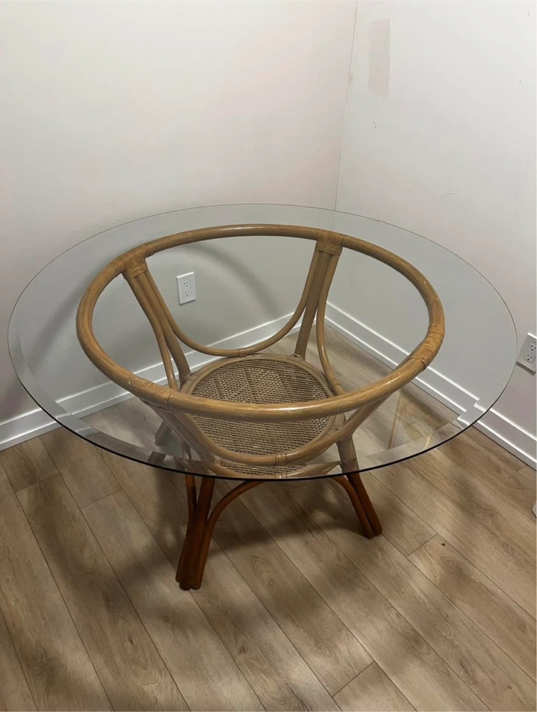 Selling a round dining table with a glass top and a rattan base. It's in great shape and would be a lovely addition to any dining space