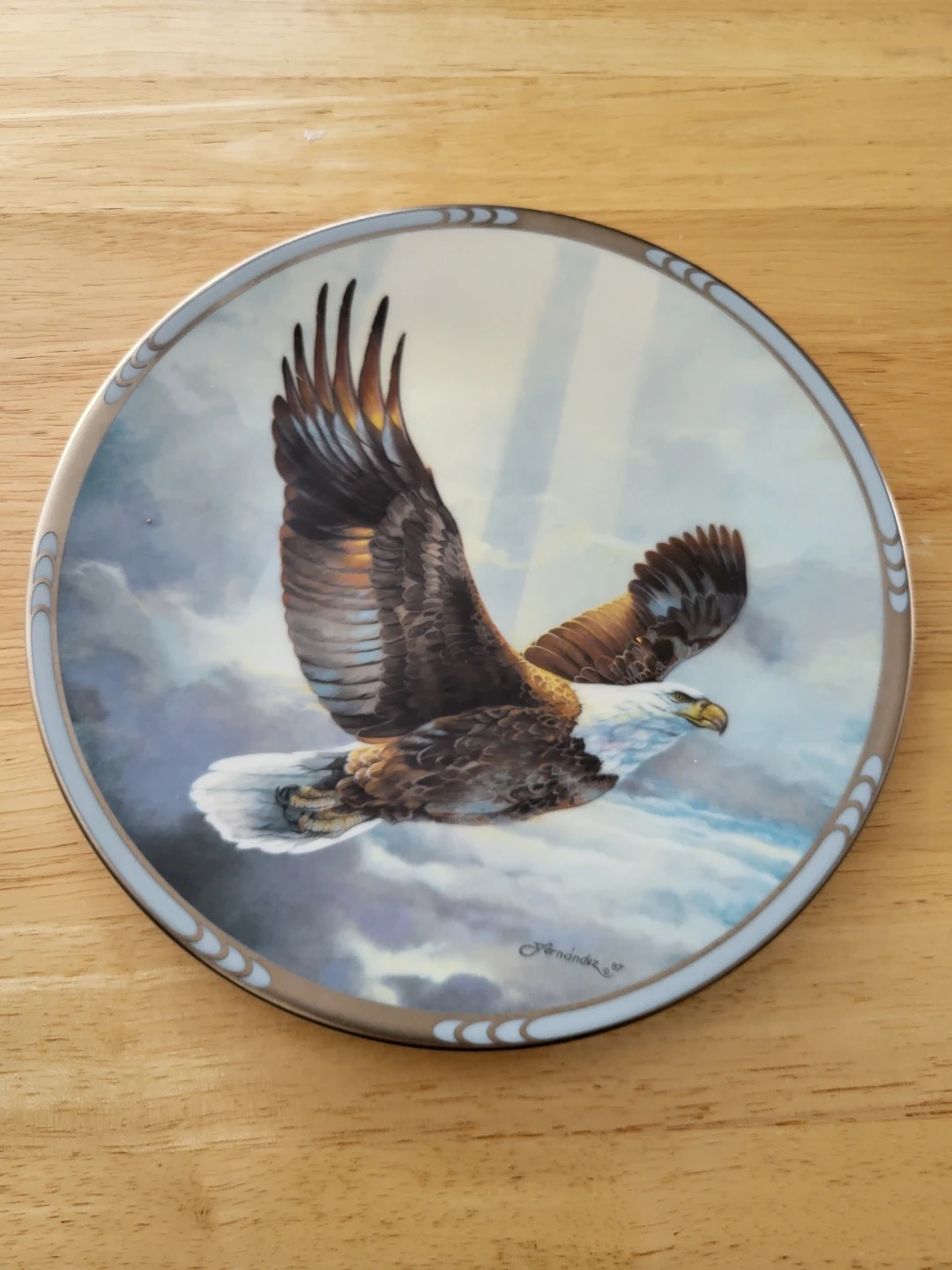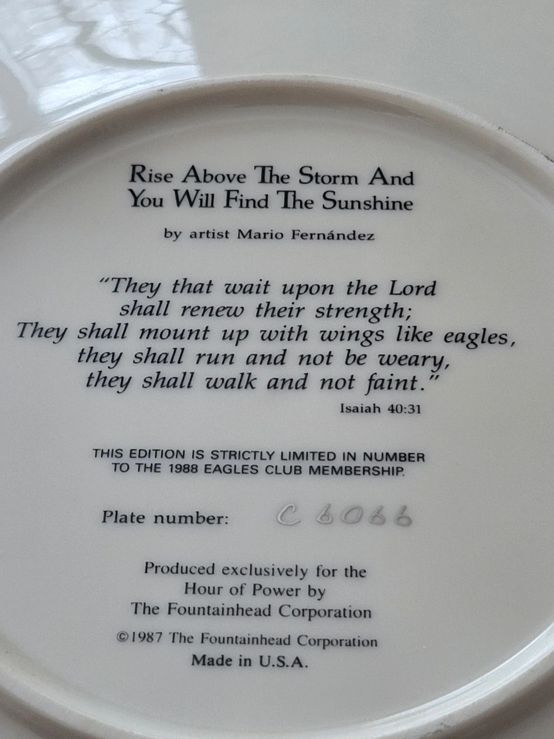 This decorative plate features artwork by Mario Fernández, titled 'Rise Above The Storm And You Will Find The Sunshine'. It is from the 1988 Eagles Club Membership edition, plate number C 6066. Produced exclusively for the Hour of Power by The Fountainhead Corporation in 1987.