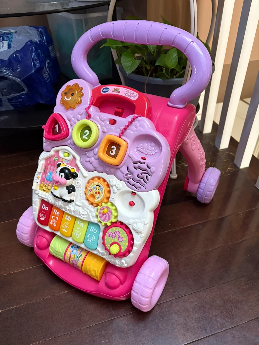 This VTech Sit-to-Stand Learning Walker is a pink musical walker. It has various interactive activities for little ones. Encourages first steps and provides playful learning opportunities.
