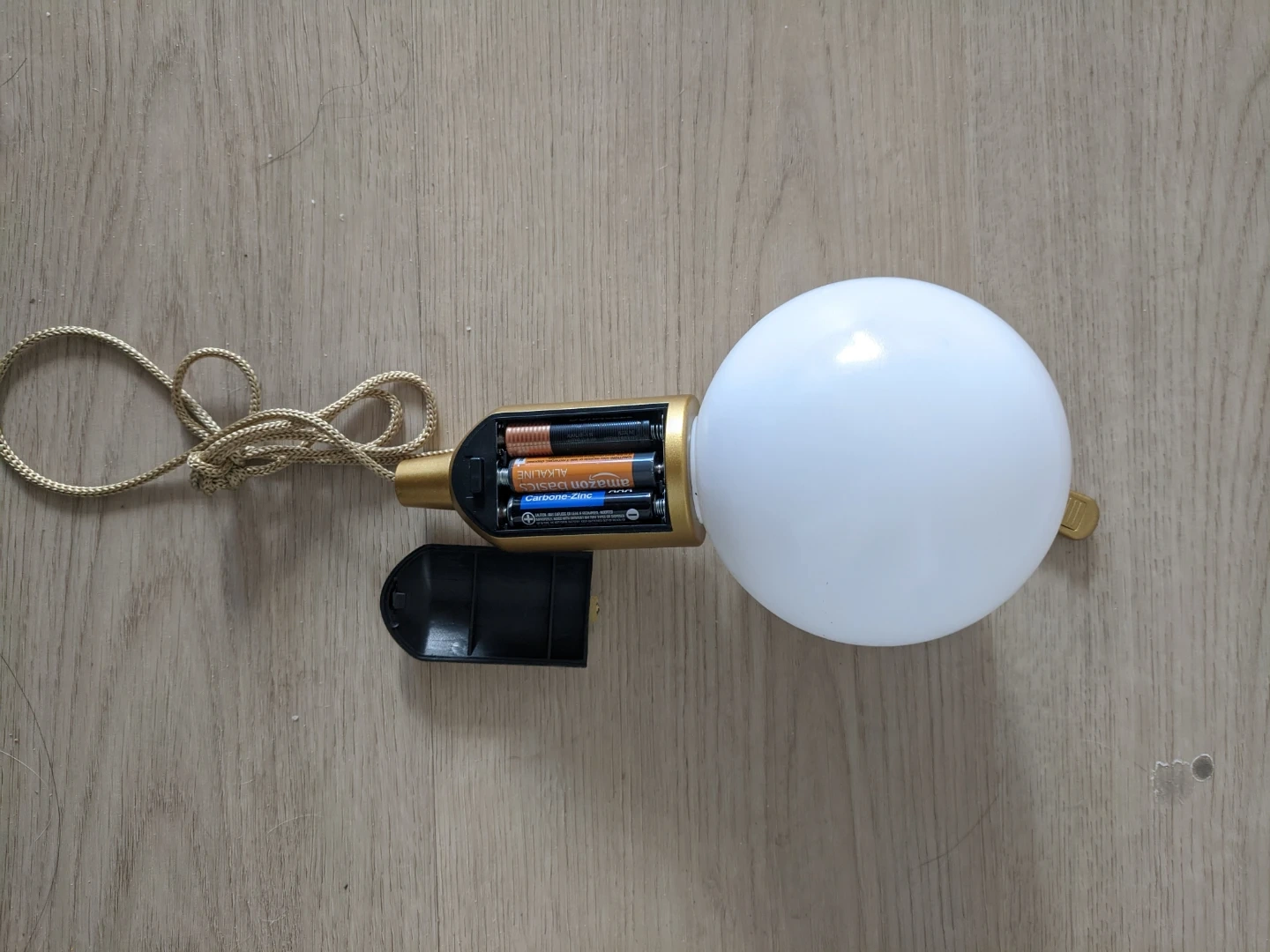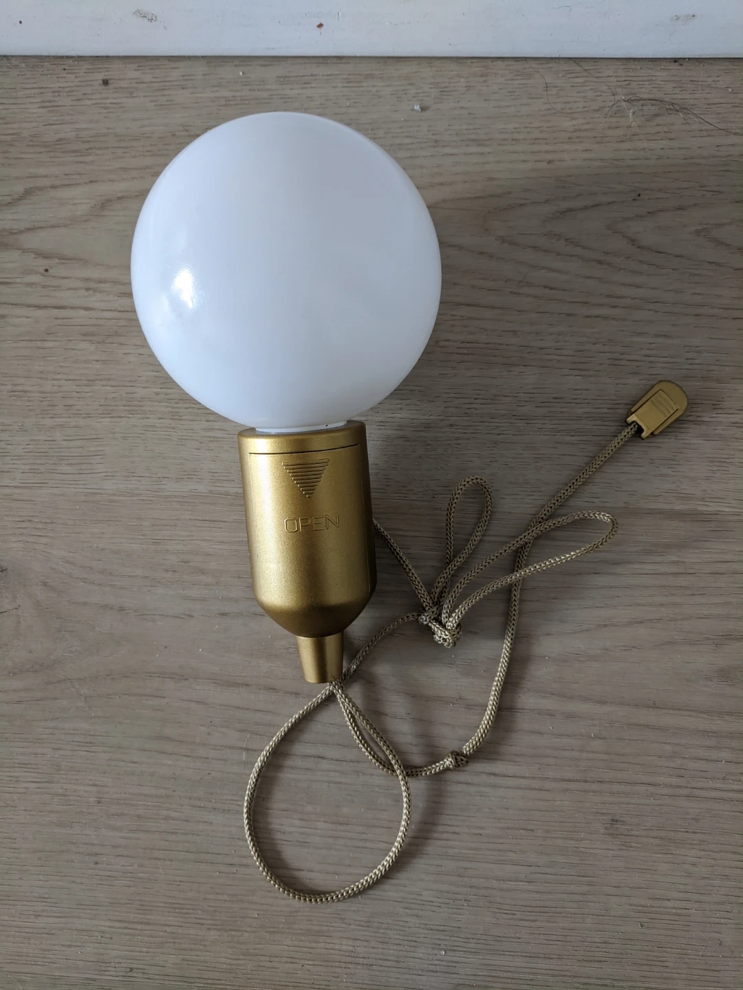 This is a portable ball light with a gold finish. It's battery-operated and has a pull cord for easy on/off. It takes 3 AA batteries. Pick up at 195 Merton Street Toronto or pick up at Subway station Davisivill. And I can deliver it to your house but you need to pay me another $3. Thanks.