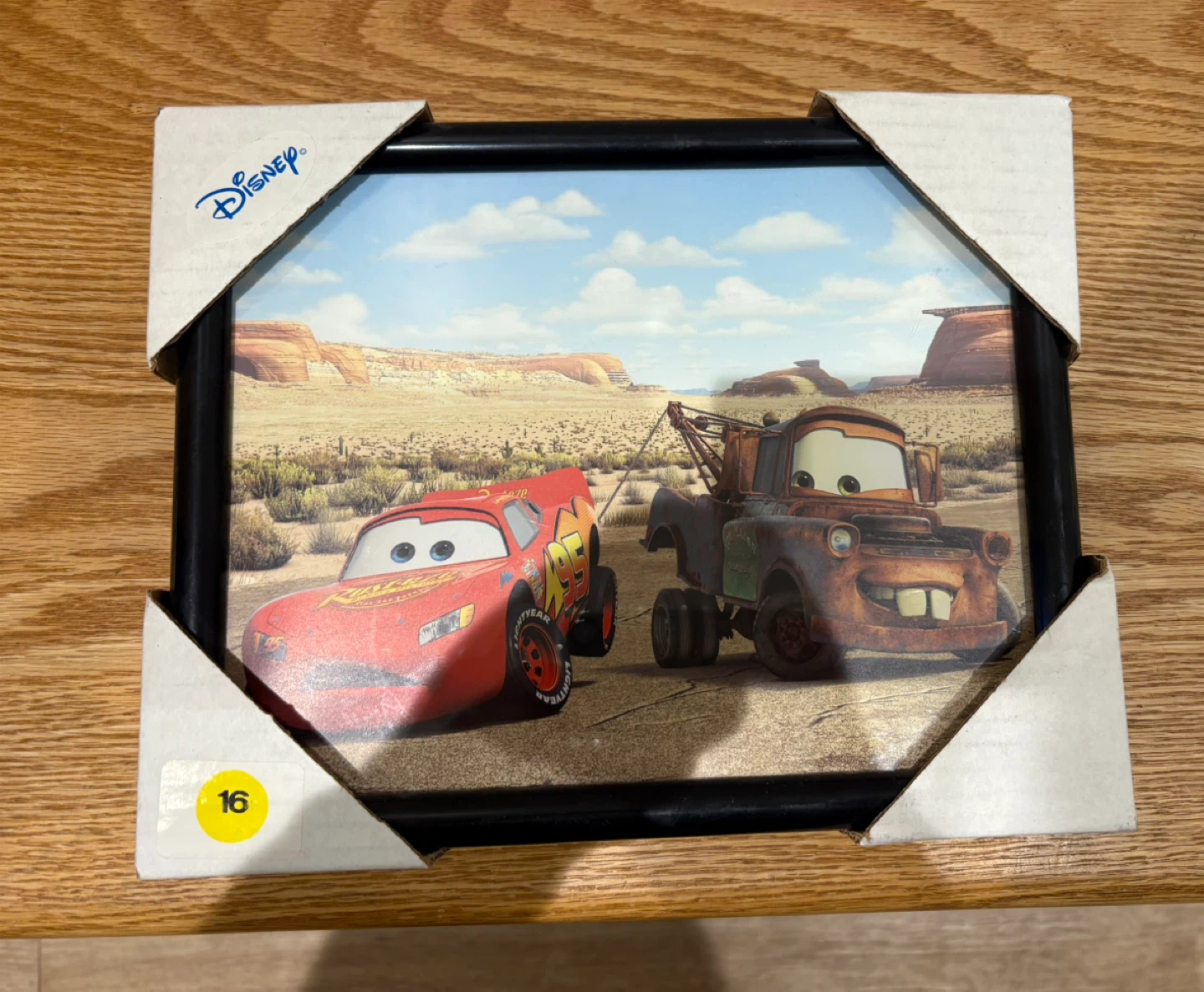 This is a framed Disney Pixar Cars print, featuring two of the franchise’s most iconic characters:
