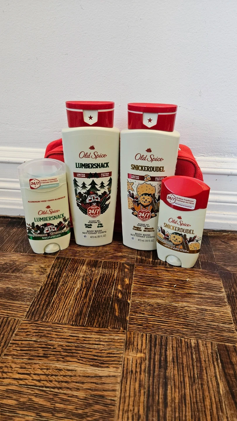 This Old Spice set includes two limited edition body washes, Lumbersnack (Pine Scent) and Snickerdudel (Sugar Biscuit Scent), both 16 fl oz. It also comes with two corresponding deodorants. Get a fresh scent for the holidays!