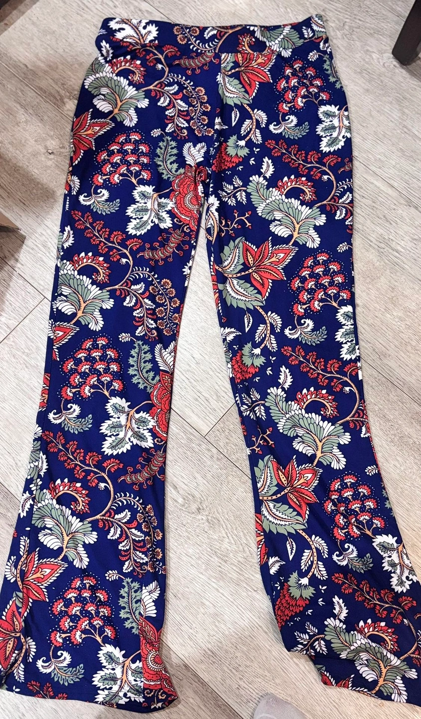 Beautiful Maze pants in a rich navy floral print. Made from an ultra-soft, stretchy fabric with a smooth, drapey feel. Designed with a more streamlined fit through the hips and thighs, opening into a wider leg at the bottom for a flowy, balanced look. The cut creates a very flattering silhouette that elongates the leg without feeling tight. These pants look polished while feeling incredibly comfortable — perfect for everyday wear. Size: Women’s Medium. Color: Navy with multicolor floral print. Fit: Fitted but stretchy through top, wide leg at the bottom. Fabric: Lightweight, stretchy, and exceptionally soft material. Waist: Pull-on style. Measurements: Waist 13 1/2 inches, Hip 17 inches, Length about [Length measurement missing]. Condition: New without tags. Never worn. Fabric is smooth, soft, and free of flaws. The fit and drape are very flattering on the body. Looks great with a fitted top or tucked blouse. Pairs well with sandals, flats, or heels for an easy casual-to-dressy outfit. Brand: Maze Collection.