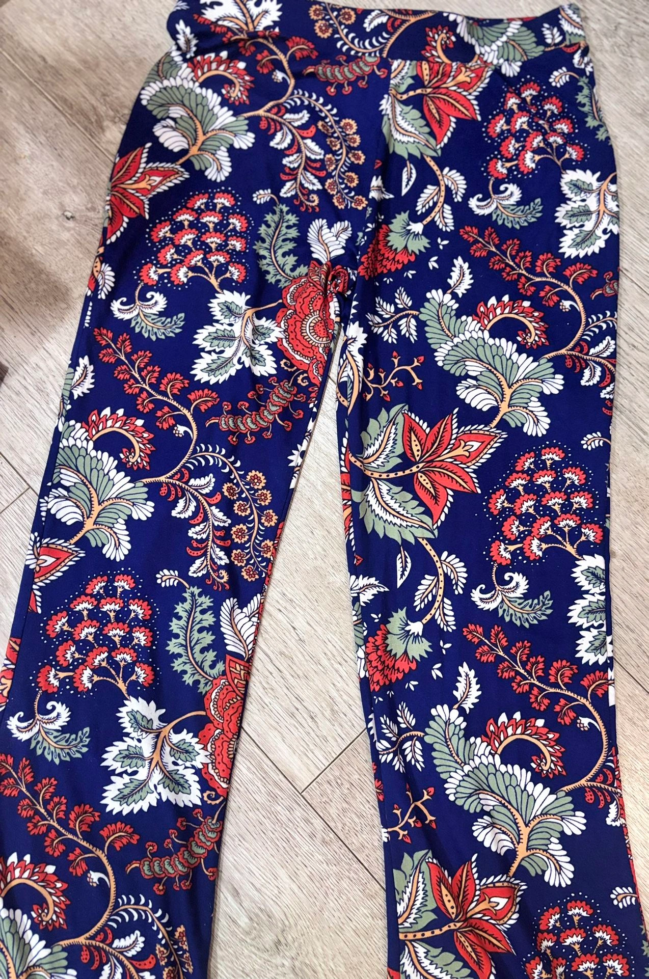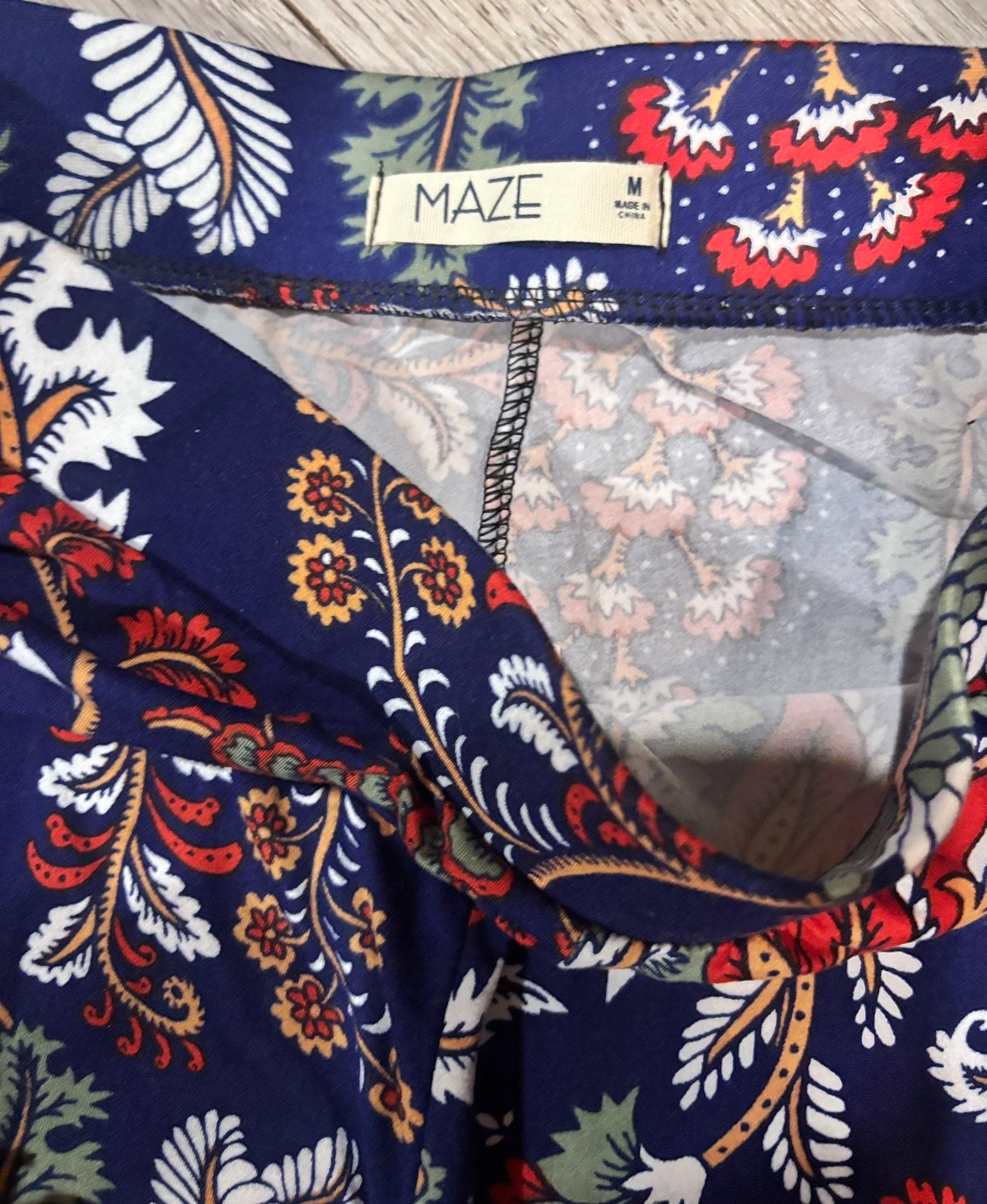 Beautiful Maze pants in a rich navy floral print. Made from an ultra-soft, stretchy fabric with a smooth, drapey feel. Designed with a more streamlined fit through the hips and thighs, opening into a wider leg at the bottom for a flowy, balanced look. The cut creates a very flattering silhouette that elongates the leg without feeling tight. These pants look polished while feeling incredibly comfortable — perfect for everyday wear. Size: Women’s Medium. Color: Navy with multicolor floral print. Fit: Fitted but stretchy through top, wide leg at the bottom. Fabric: Lightweight, stretchy, and exceptionally soft material. Waist: Pull-on style. Measurements: Waist 13 1/2 inches, Hip 17 inches, Length about [Length measurement missing]. Condition: New without tags. Never worn. Fabric is smooth, soft, and free of flaws. The fit and drape are very flattering on the body. Looks great with a fitted top or tucked blouse. Pairs well with sandals, flats, or heels for an easy casual-to-dressy outfit. Brand: Maze Collection.