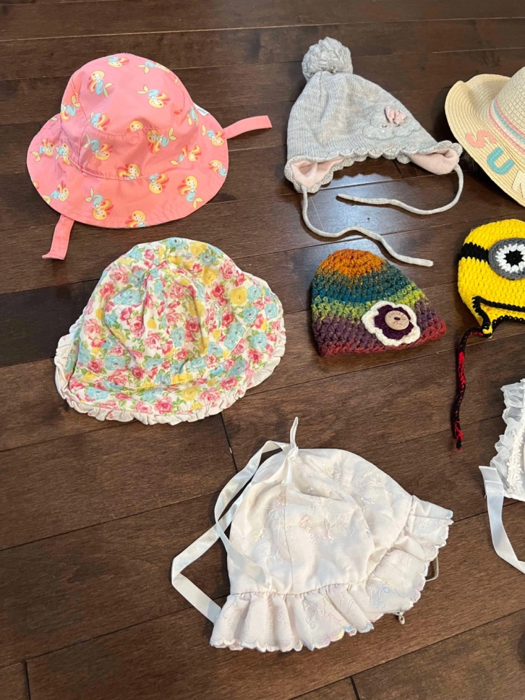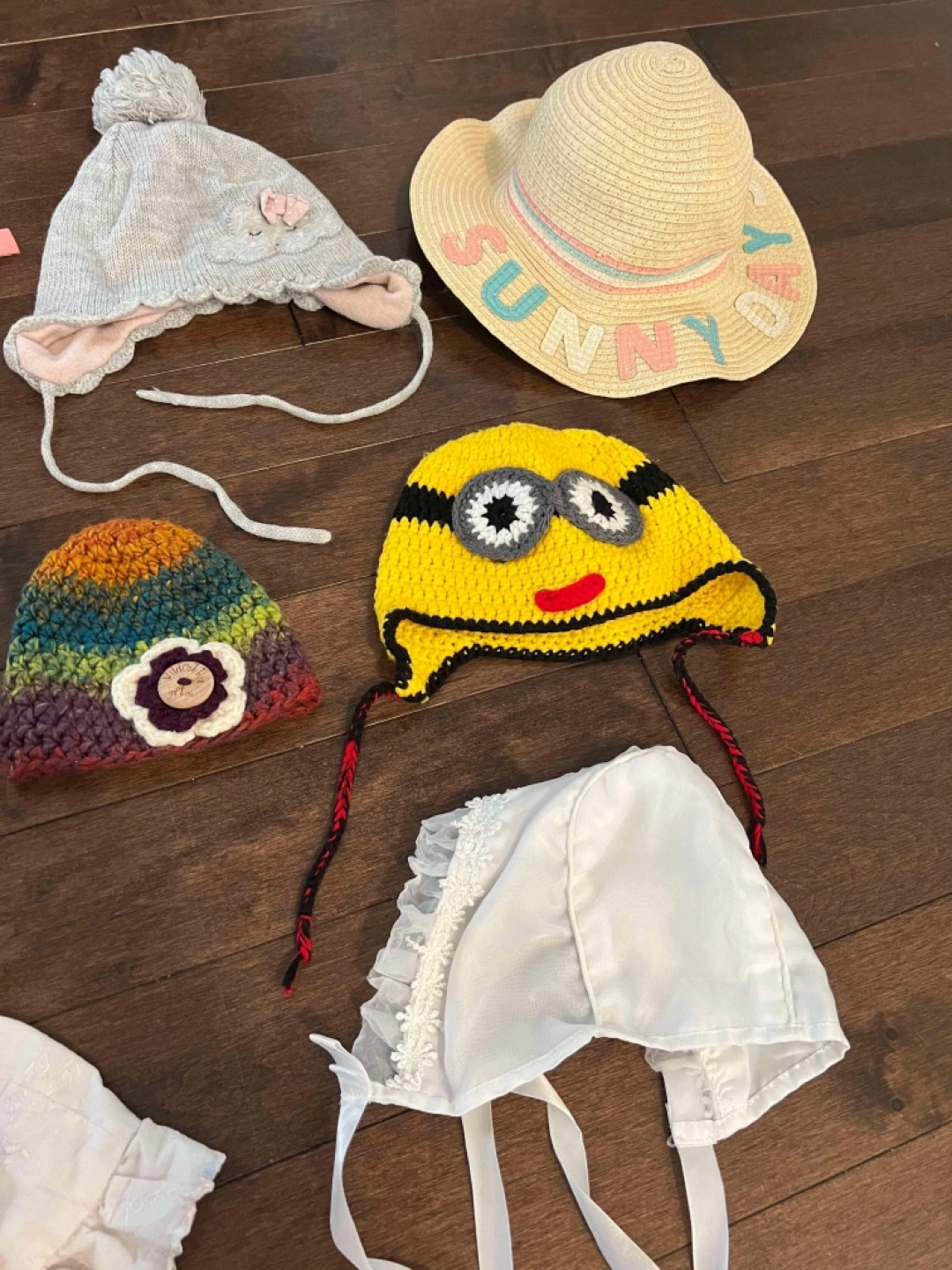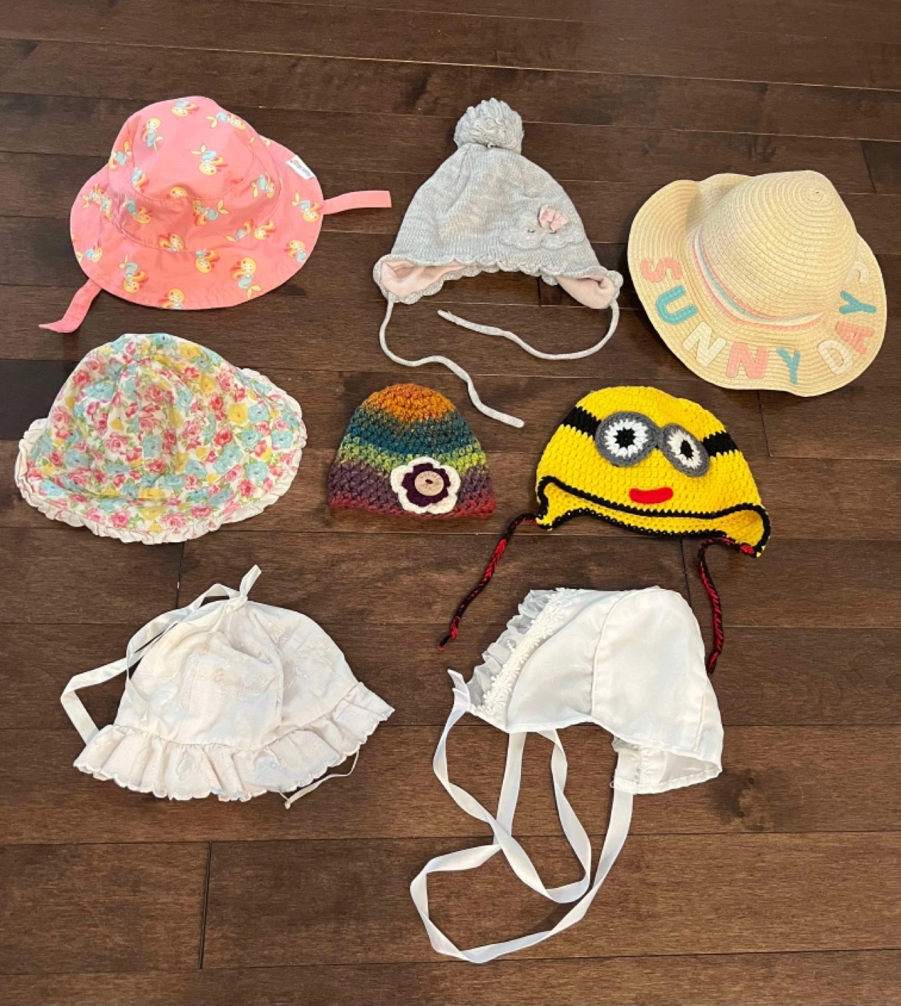 Assortment of adorable hats for babies and toddlers. Includes sun hats, knit hats, and crocheted hats. Various colours and patterns. Great for everyday wear or special occasions.