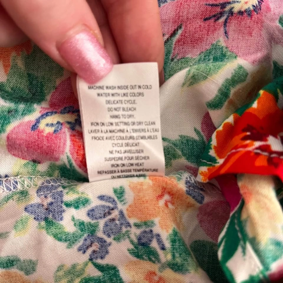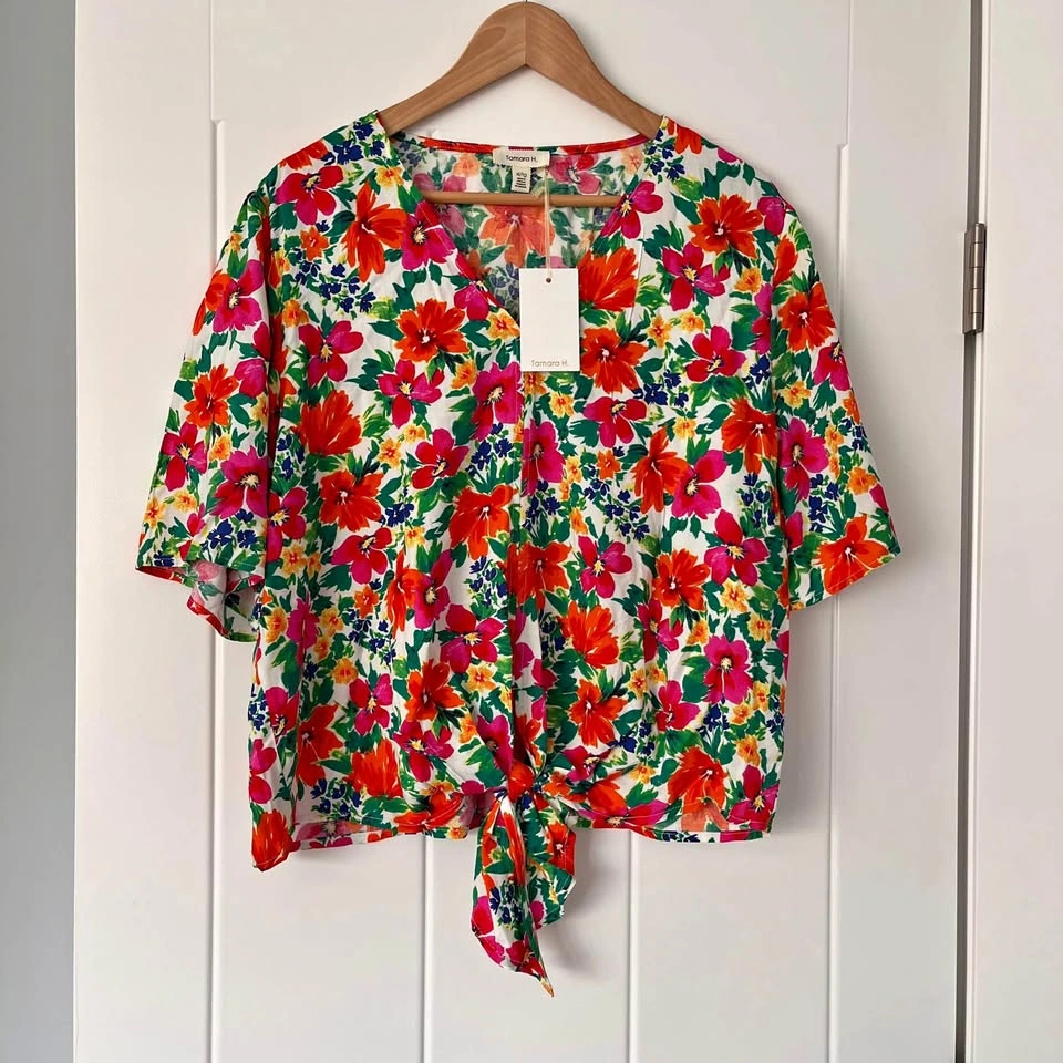 12New with tags Tamara H. gorgeous floral ladies short sleeve blouse with a front tie. Brighten your wardrobe with this vibrant floral v-neck top. Featuring a stunning mix of red, pink, and orange, blue and green flowers on a white background. Soft and comfortable with a slightly boxy fit, add a splash of colour to your outfit! Women's Size XL 100% Rayon Measurements are approx.: Length 59cm Pit to pit 58m Porch pick up west Maple Ridge.