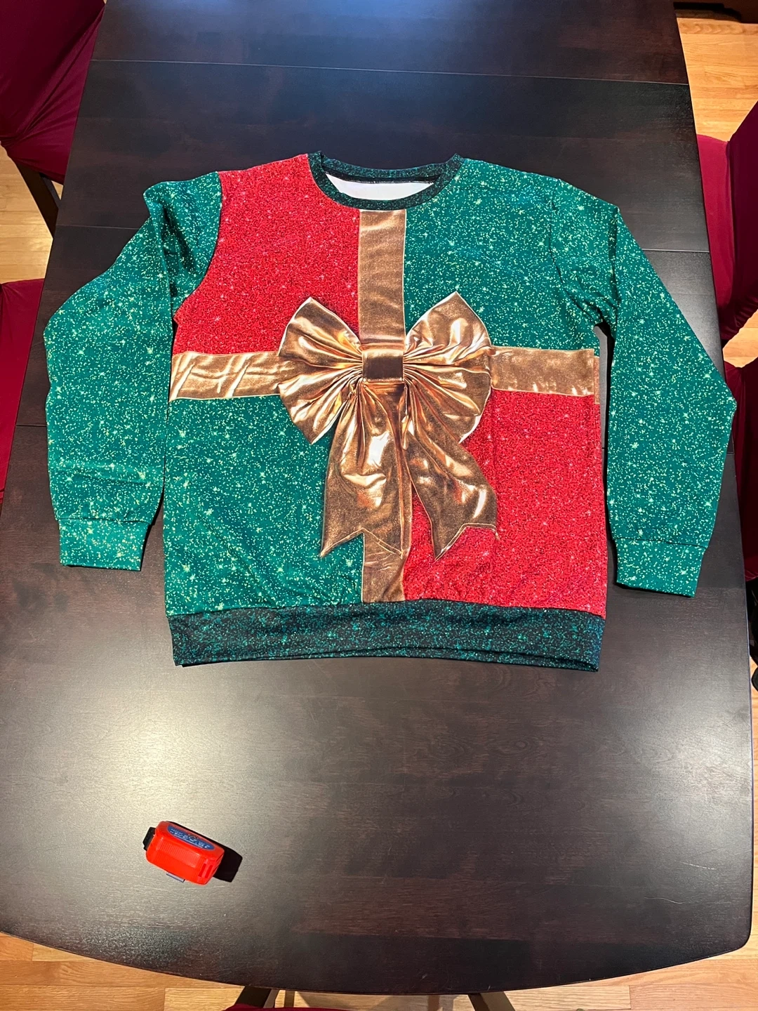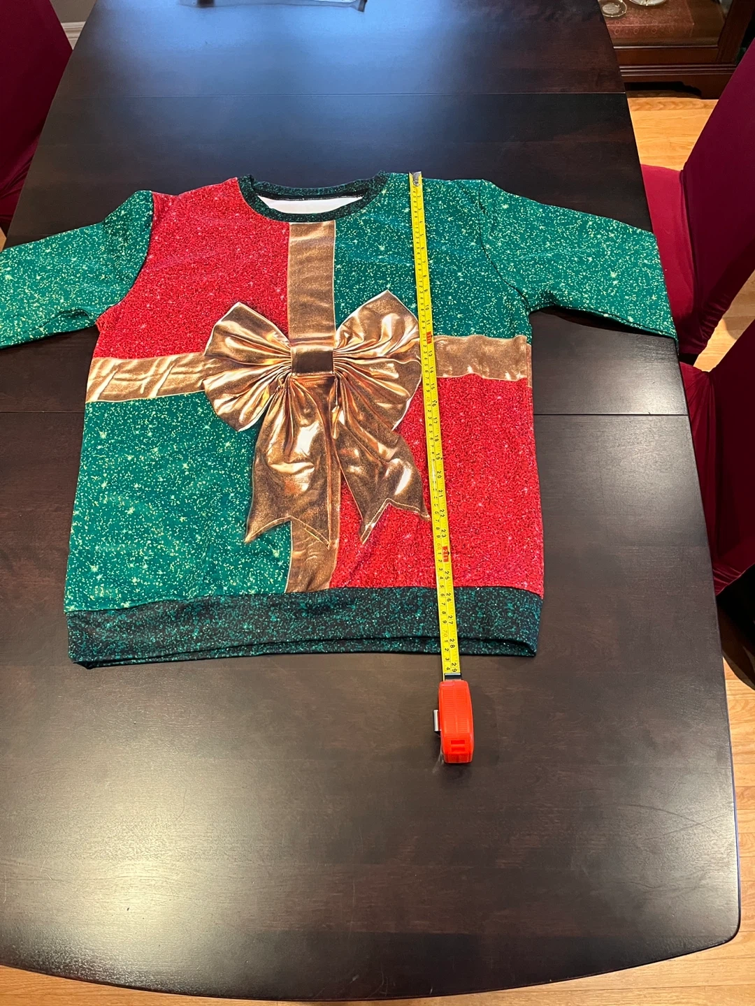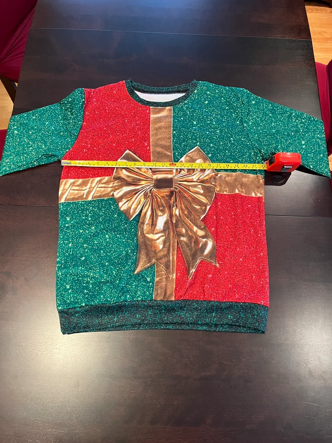 10Festive Christmas sweater, perfect for the holidays! The sweater has a gift-wrapped design with green and red sections, accented with a gold ribbon and bow. It measures approximately 22 inches across. Size: L Code: KB3