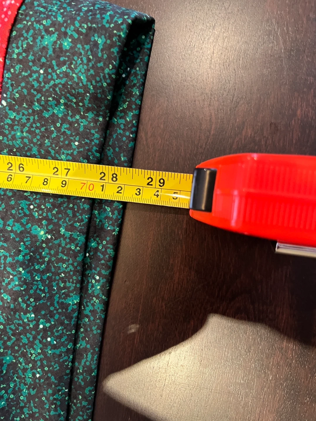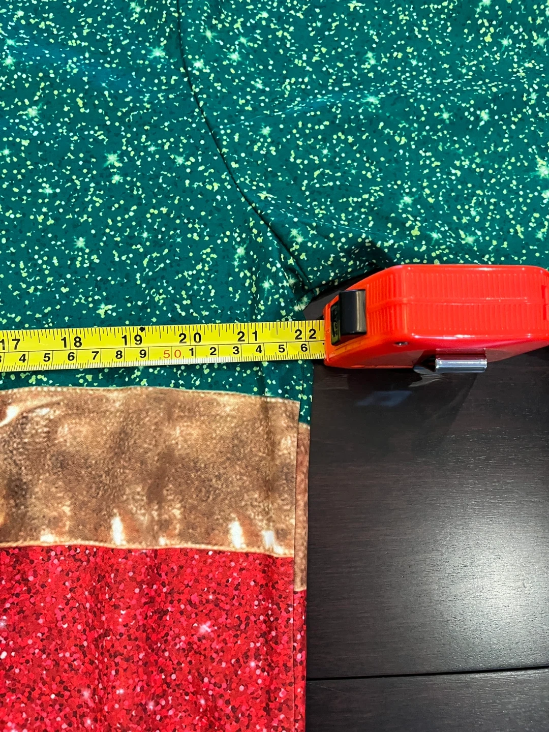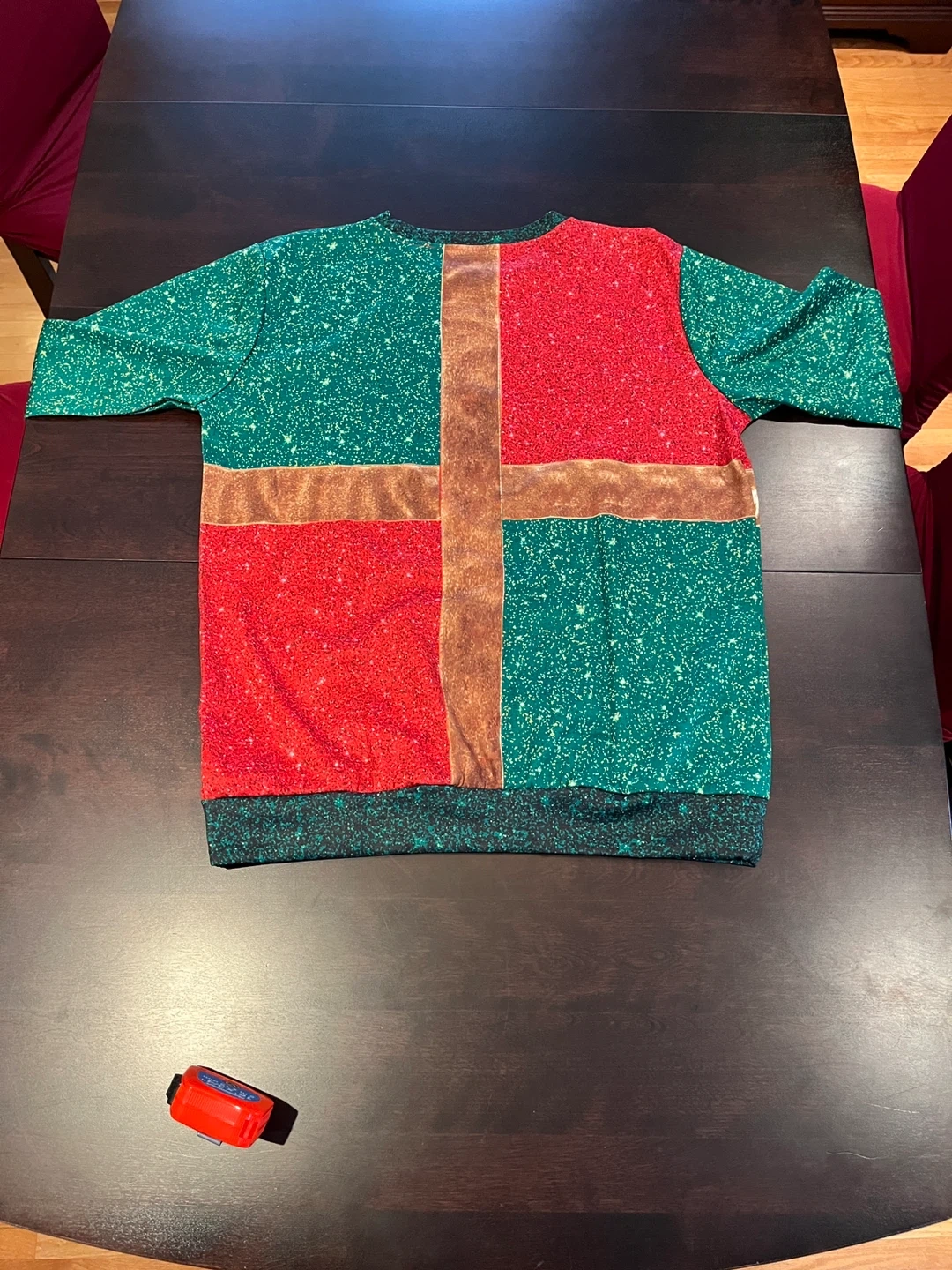 10Festive Christmas sweater, perfect for the holidays! The sweater has a gift-wrapped design with green and red sections, accented with a gold ribbon and bow. It measures approximately 22 inches across. Size: L Code: KB3