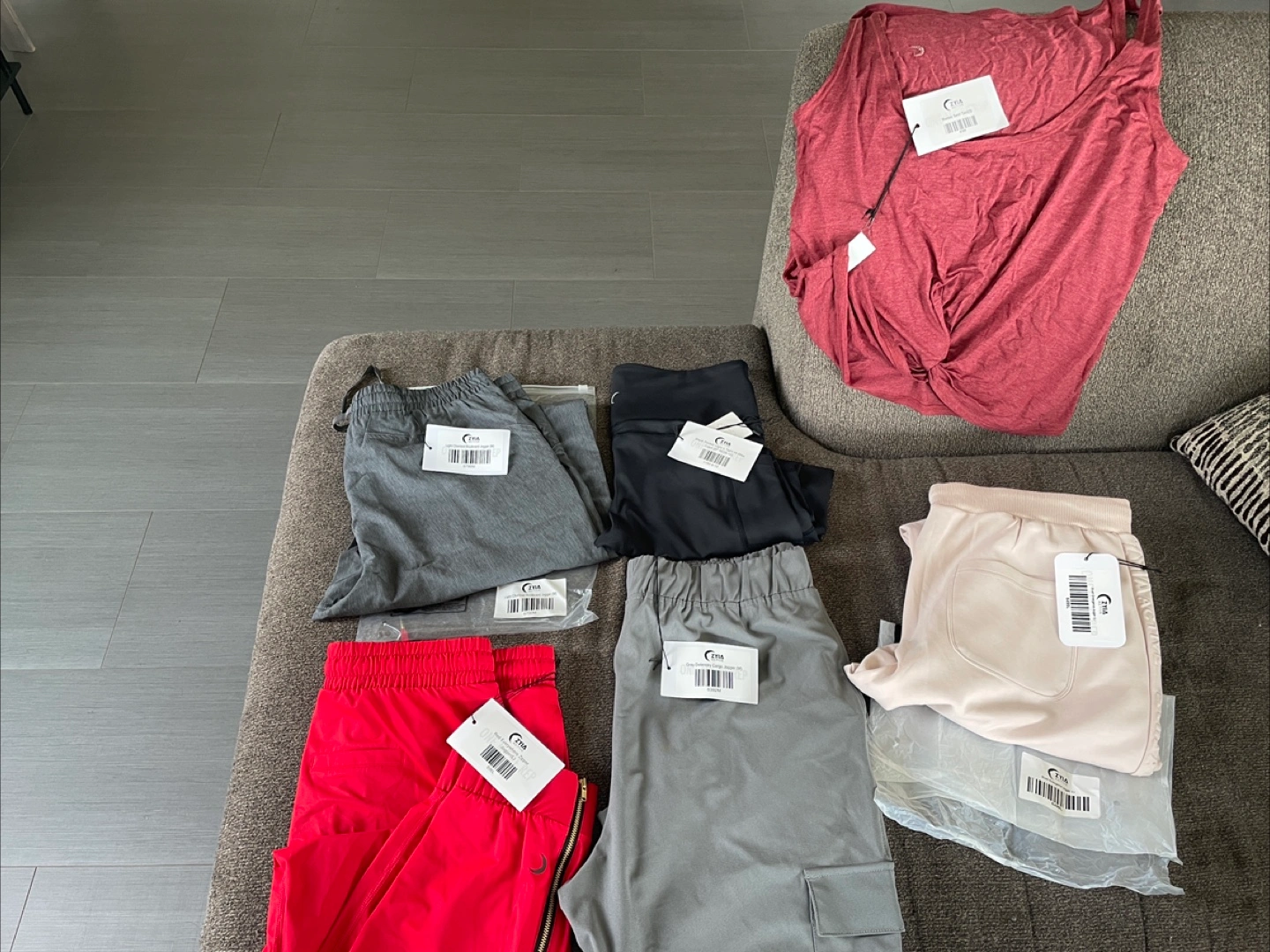 Maroon swirl tank size Small $25 Grey Delancey cargo jogger medium $60 Red everywhere zipper jogger large $75 Light charcoal boulevard jogger medium $55 Blush emergence jogger large $65 Black light n tight hi-rise capri 20” with pocket $55